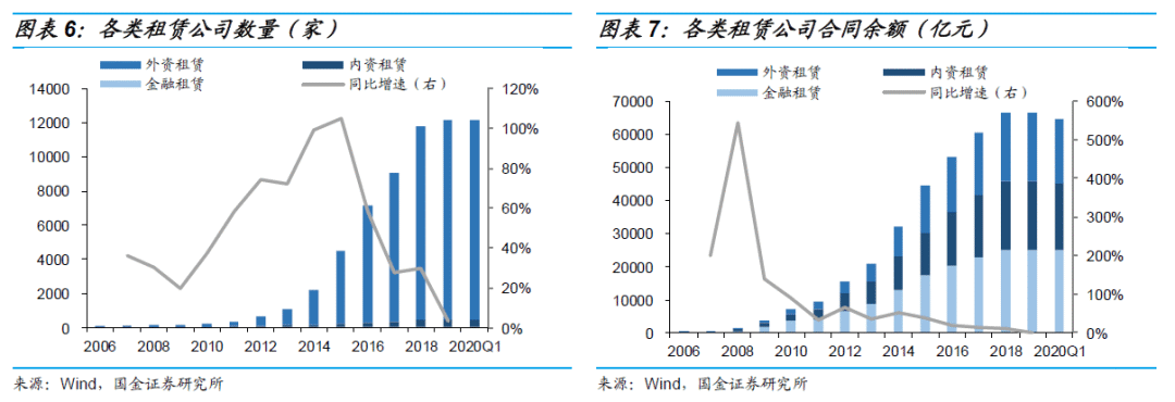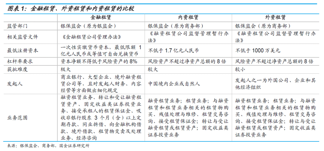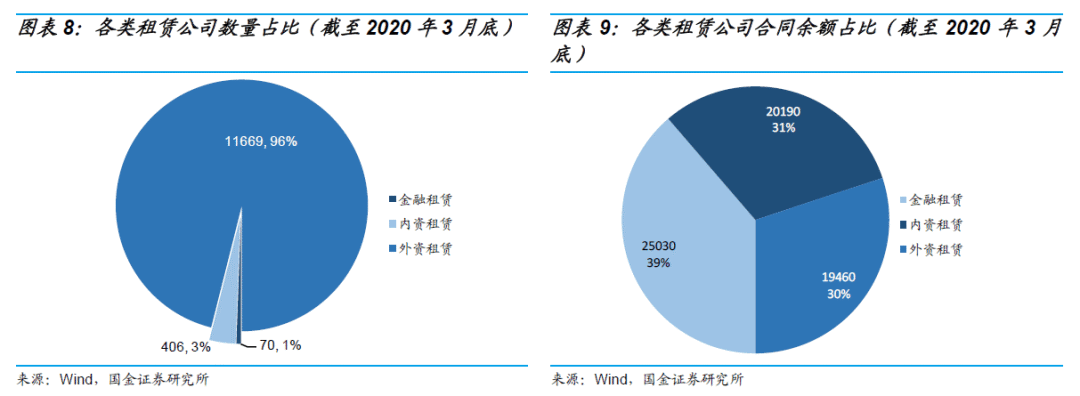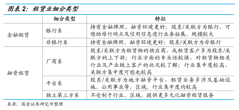 融资租赁行业概况:租赁公司可以分为金融租赁公司和融资租赁公司。其中金融租赁公司为金融机构,持有金融牌照,融资环境更为友好,受到更严格的监管,可细分为银行系和非银行系;融资租赁公司为非金融机构,可细分为厂商系、平台系和独立第三方系。2020年6月9日,银保监会正式发布《融资租赁公司监督管理暂行办法》,对融资租赁公司的经营能力、风控能力提出了更高的要求,监管标准向金融租赁公司要求靠拢,在对租赁公司进行分析时,需要更加关注公司对新规定的适应能力,密切关注公司的杠杆率、资产质量和业务转型进展。