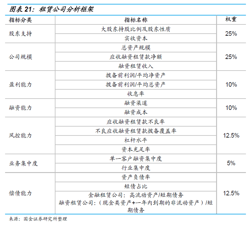 租赁行业属于高杠杆、轻资产的行业,以收取净息差为主要的盈利来源,不同的租赁公司细分类型对应不同的外部融资环境、客户与行业集中度。基于这些特点,我们认为需要从股东支持、公司规模、盈利能力、融资能力、风控能力、业务集中度和偿债能力对租赁公司进行分析。