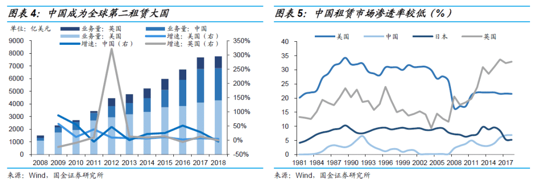 放眼全球,我国租赁行业近年来发展迅速,已成为全球第二租赁大国。2014-2017年,租赁业务量增速均超20%,远高于美国、英国等发达国家的业务增速;2018年我国租赁市场业务量为2544.2亿美元,较2017年的2656.8亿美元下降了4.24%,增速出现跳水,转正为负,我国租赁行业发展进入增长放缓期。同时,我国租赁市场渗透率(即当年租赁市场业务量/当年固定资产投资额)较低,2018年该值为6.9%,低于美国(21.5%)、英国(32.9%),略高于日本(5.2%);虽然近年来我国租赁市场渗透率缓慢上升,但与美国等发达国家相比,仍有较大的提升空间。