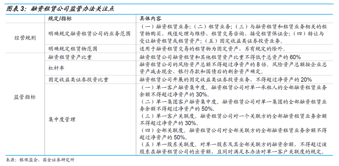 《暂行办法》对融资租赁公司的经营能力、风控能力提出了更高的要求,监管标准向金融租赁公司要求靠拢,在对租赁公司进行分析时,需要更加关注公司对新规定的适应能力,密切关注公司的杠杆率、资产质量和业务转型进展。