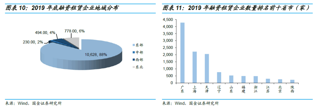 截至2019年底,我国31个省、市、区都设立了融资租赁公司,绝大数企业分布在东部地区。广东、上海、天津、辽宁、山东、福建、浙江、江苏、北京、陕西等10个省市的企业数均超过200家,其总数占全国总数的95%以上,其中2019年山东省融资租赁企业增加140家,增长36.65%。