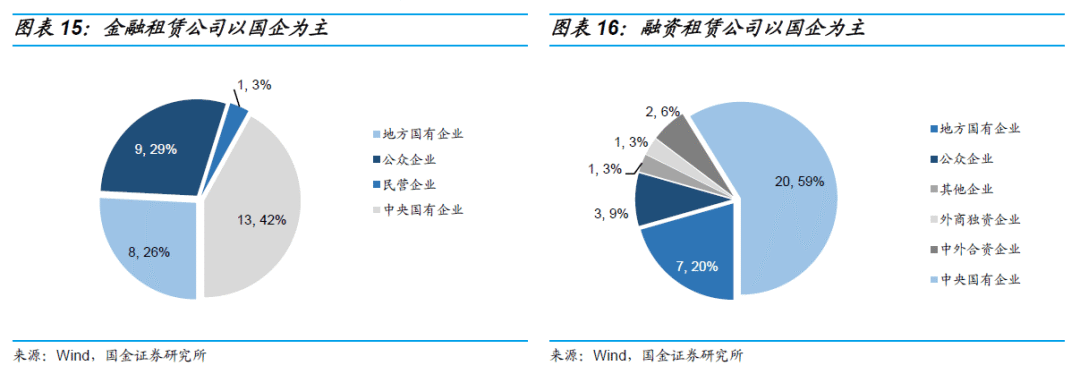 在公司属性上,无论是金融租赁还是融资租赁公司,均以国企为主。金融租赁公司为国企的比例为68%,其中央企占比42%;融资租赁公司中,国企占比达79%,其中央企占59%,存在1家外商独资企业和2家中外合资企业。