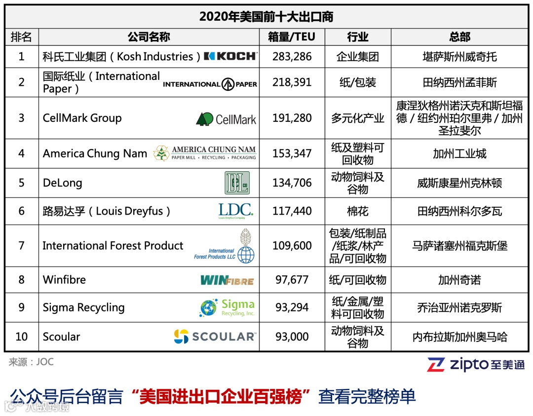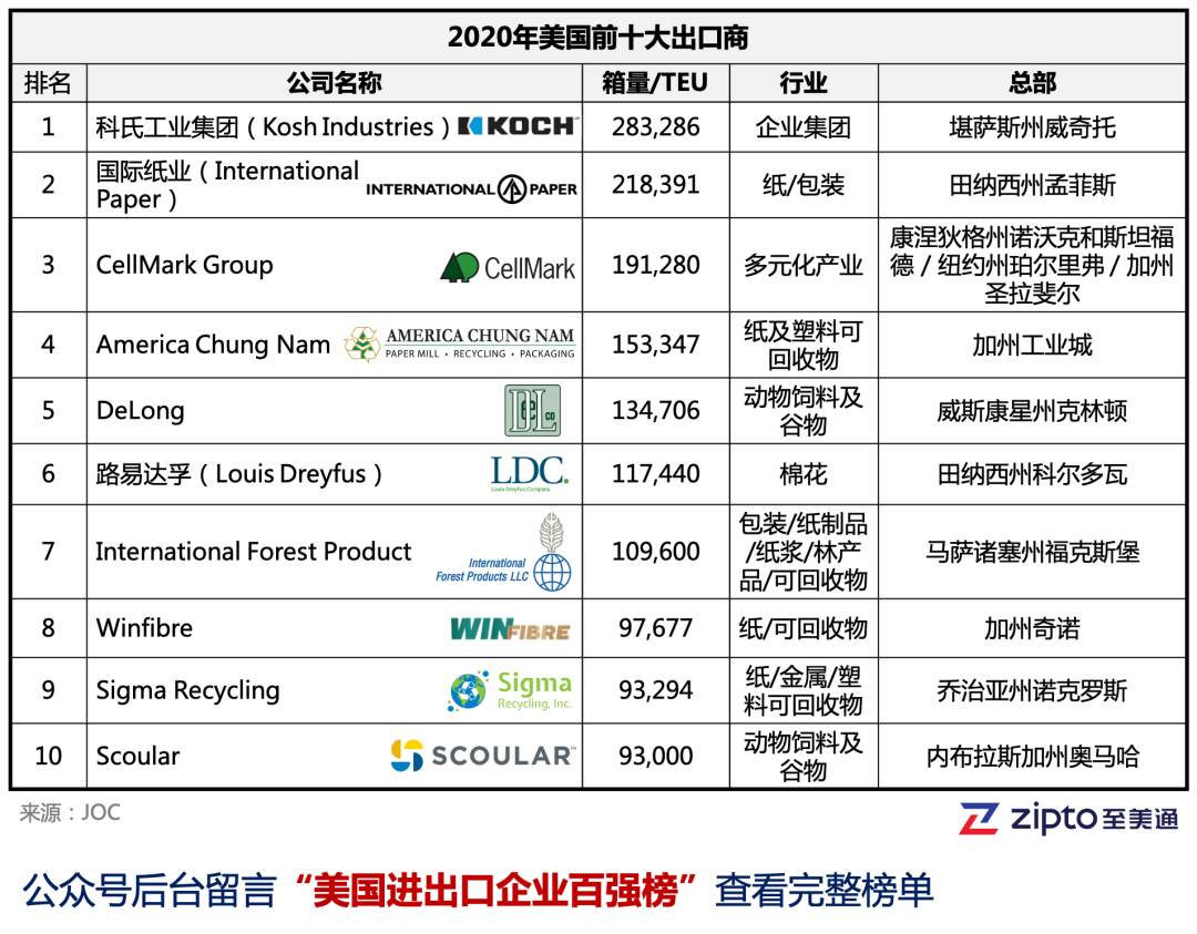 出口方面,科氏工业集团(Koch Industries)继续占据榜首位置,其28.3万TEU的进口量较2019略有下降。第二位的国际纸业(International Paper)出口量下滑了5%, 至21.8万TEU。