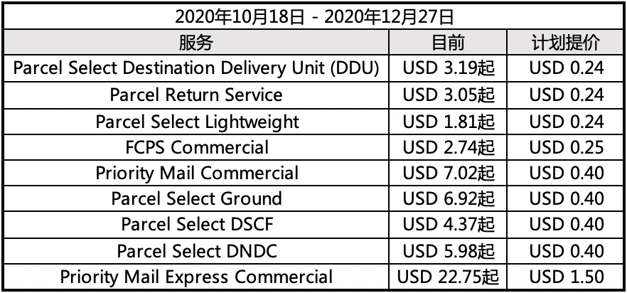 【USPS将于10月首次收取旺季附加费】美国邮政已向邮政管理委员会(PRC)提交临时价格更改通知,该更改将于2020年10月18日生效。价格变动如下: