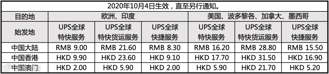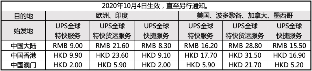 【UPS更新10月旺季附加费标准】鉴于市场情况,自2020年10月4日起,UPS将调整特定货件的旺季附加费。同时,旺季附加费会继续调整,且旺季的时段可能会延长或以其他方式做调整。