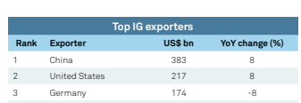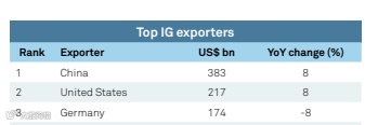 在IG出口商方面,2022年2季度,全球IG出口前三名为中国、美国和德国,不过德国的IG出口同比下降8%。