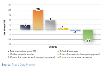 2022年第二季度,IG在全球贸易总额(不包括燃料)中的份额保持在50%,这一比例在过去十年中一直保持不变。IG是指用于生产最终产品的投入产品,是全球供应链活动的指标。
