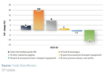 然而,2022年第二季度全球矿石、宝石和稀土出口同比下降11%,反映出铁矿石价格下跌。其中从澳大利亚进口的铁矿石降幅最大(-25%)。