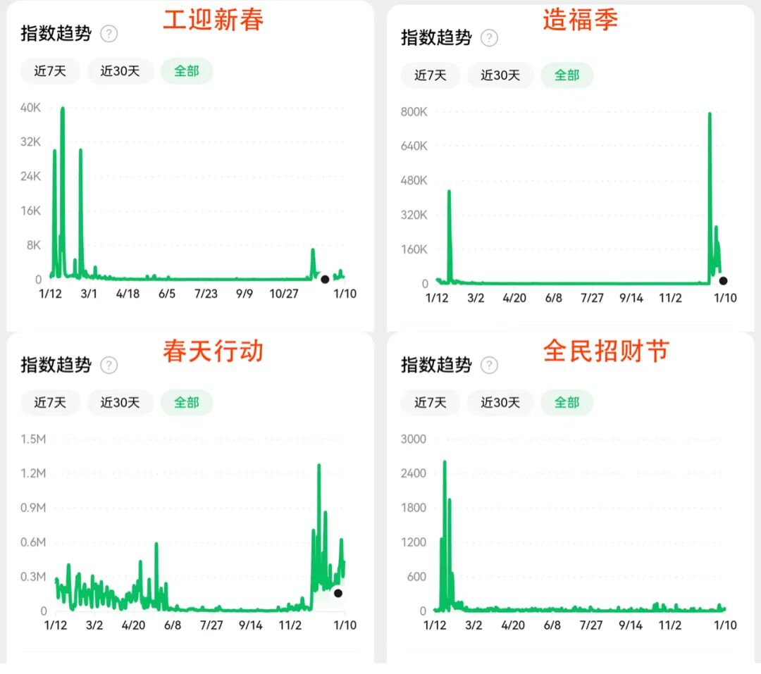 “‘工’迎新春”是工行数年坚持的旺季营销活动,建行在2021年将此前的“兴建旺行”主题营销升级为“造福季”大型活动,农行传统的“春天行动”迎来第18个年头,招行的“全民招财节”则巧妙地将银行品牌与财富衔接。