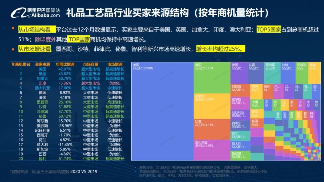 2、从市场结构看,平台过去12个月数据显示,买家主要来自于美国、英国、加拿大、印度、澳大利亚;TOP5国家占到总商机超过