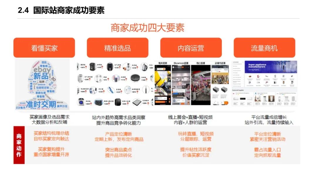 3、国际站商家成功四大要素:看懂买家画像、洞察高需求品进行精准选品、线上展会+直播+短视频多方式丰富内容运营、站外引流抓住流量商机。