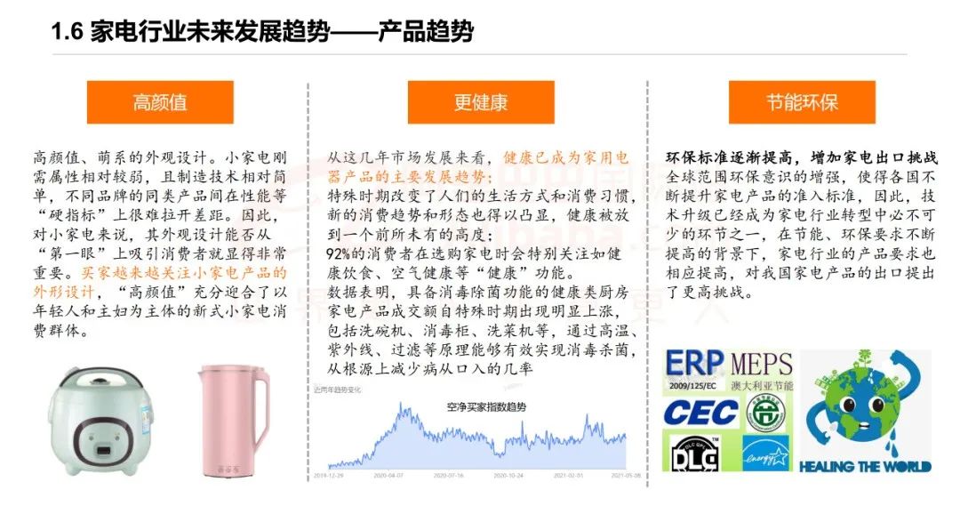 2、家电产品的未来发展趋势:智能化、多功能、高颜值、更健康、节能环保。