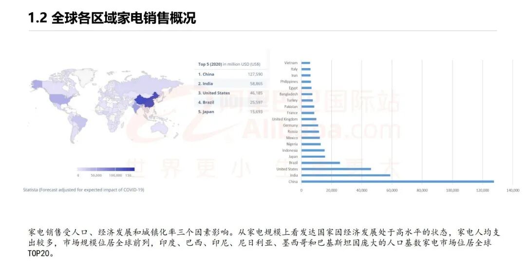 1、家电销售受人口、经济发展和城镇化率三个因素影响。发达国家因经济发展处于高水平的状态,家电人均支出较多,市场规模位居全球前列,印度、巴西、印尼、尼日利亚、墨西哥和巴基斯坦因庞大的人口基数家电市场位居全球TOP20。
