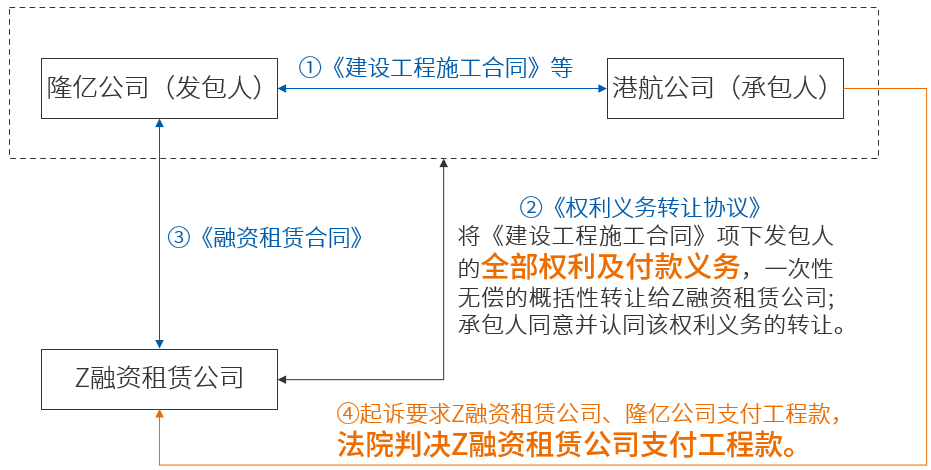 笔者理解,在上述案例中,Z融资租赁公司签署《权利义务转让协议》的本质诉求,为变更《建设工程施工合同》等合同项下设备采购的付款义务人、设备的所有权人为出租人,《权利义务转让协议》属于直租交易中的三方设备买卖合同。但是,Z融资租赁公司实际签署的《权利义务转让协议》却约定了“本协议项下的转让标的为乙方作为发包人在《施工合同》项下的全部权利及付款义务”。从《权利义务转让协议》的约定内容看,Z融资租赁公司享有了《建设工程施工合同》等合同项下的全部权利、承担付款义务,法院据此认定了《建设工程施工合同》等合同项下作为发包人的权利义务均由Z融资租赁公司取得,《权利义务转让协议》被视为了《建设工程施工合同》的变更,Z融资租赁公司据此概括性地承继了《建设工程施工合同》项下工程款的付款义务。