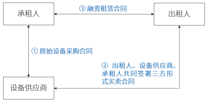 在传统直租交易中,依据《民法典》第735条之规定,直租是承租人与出租人签订融资租赁合同,出租人向设备供应商购买租赁物的交易方案。实务中,出租人向设备供应商购买租赁物的交易环节,一般采用出租人、承租人、设备供应商共同签署三方形式买卖合同的方式完成,并由承租人、设备供应商另行就租赁物签署与设备质量等相关技术性质合同。