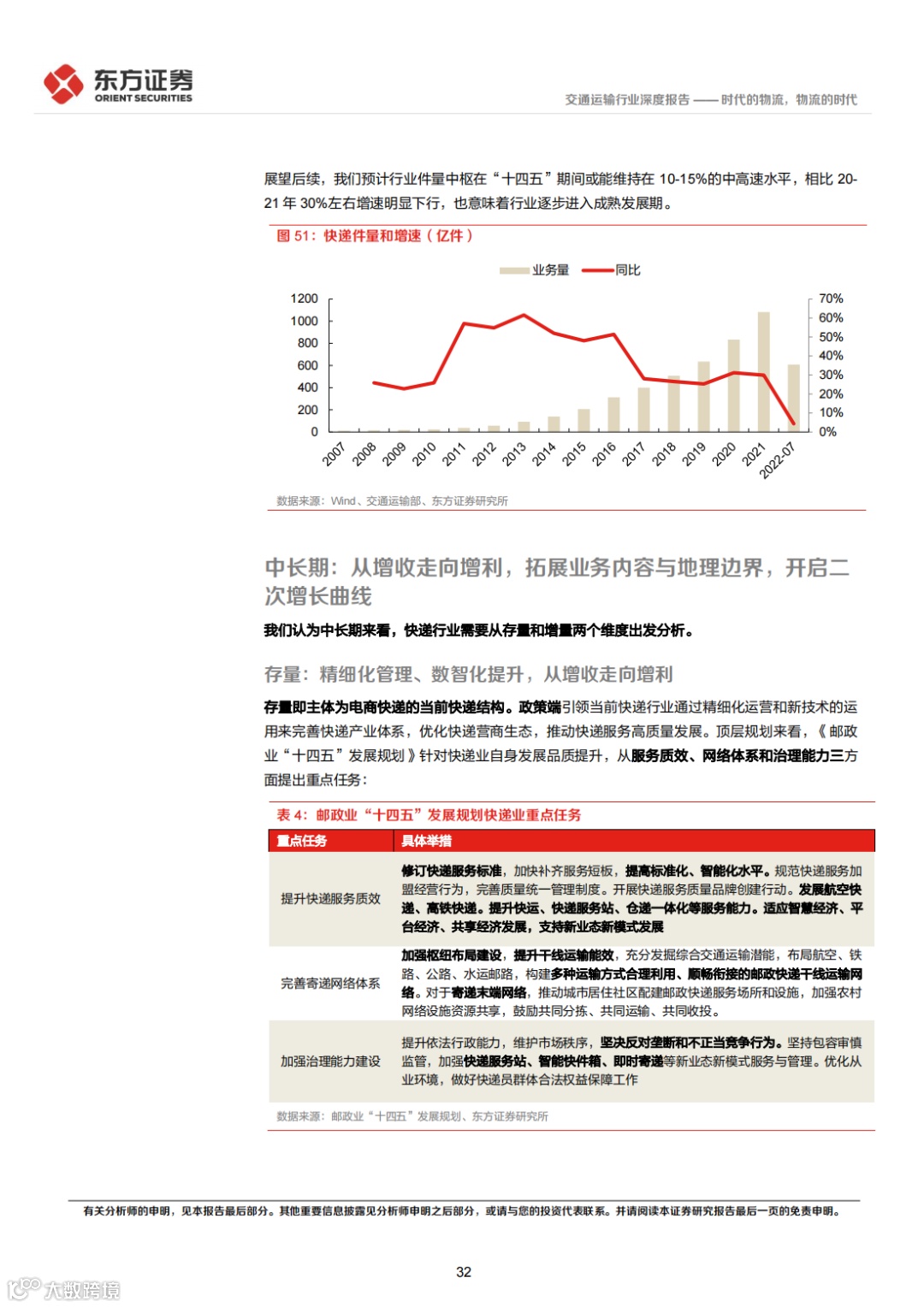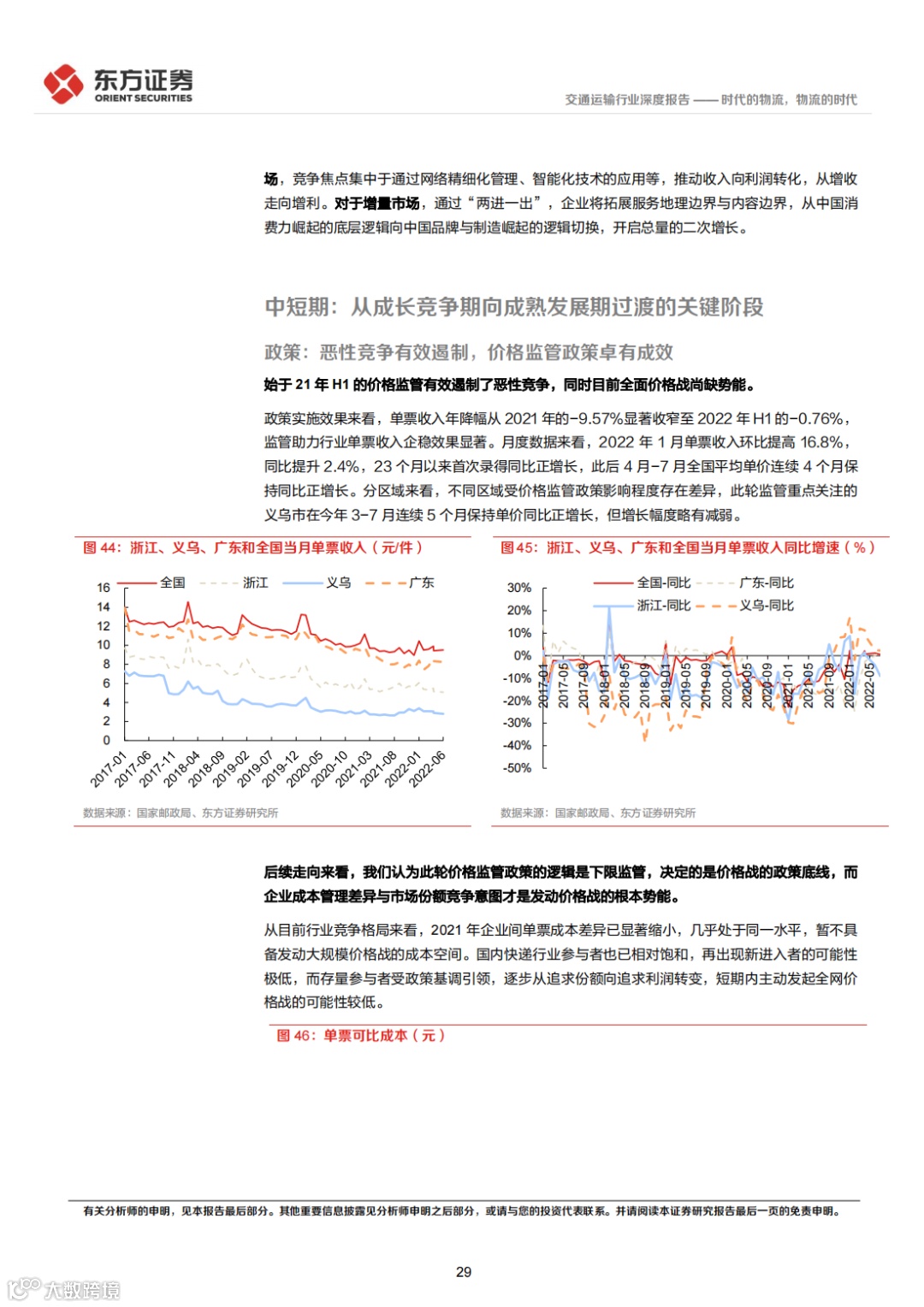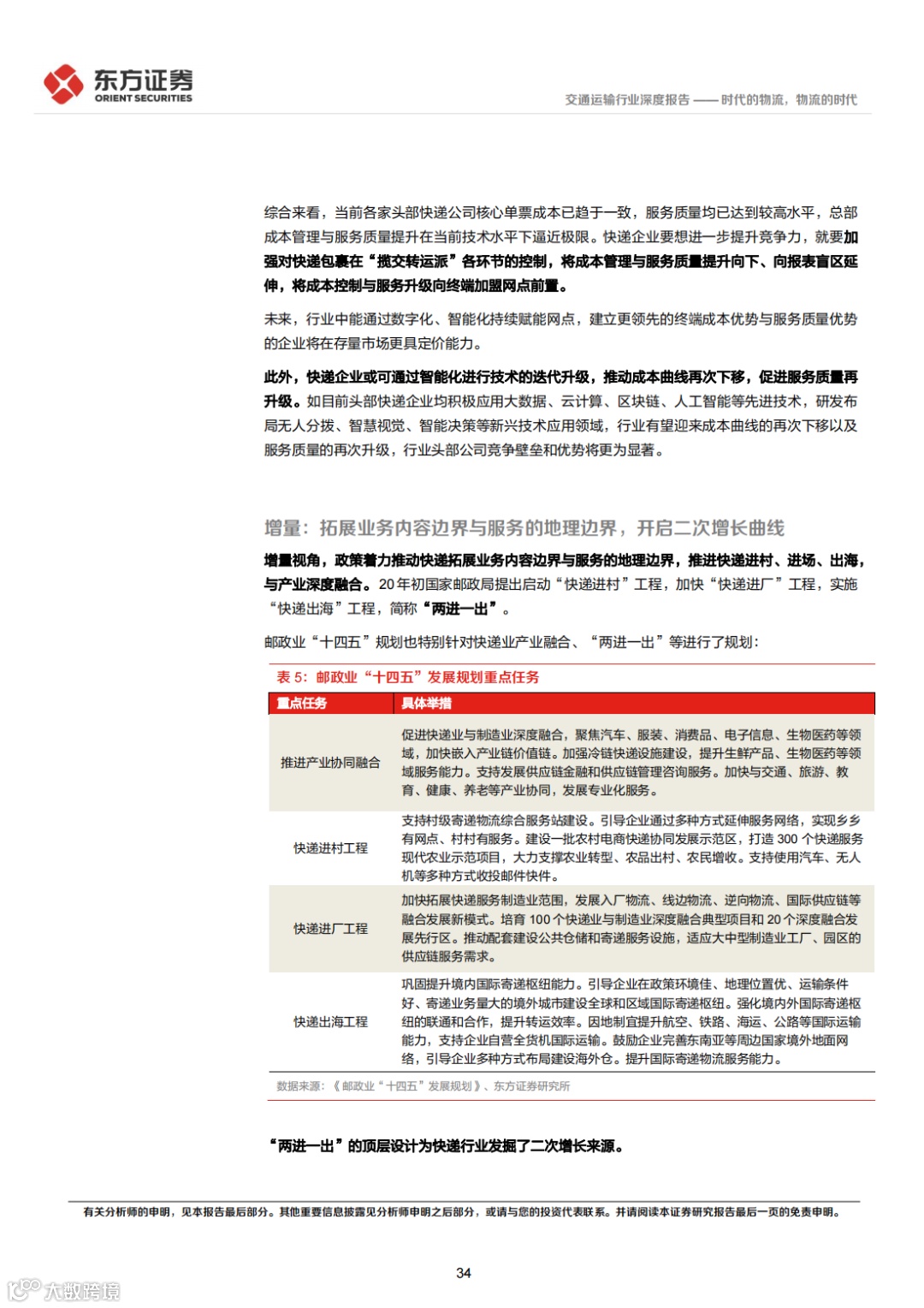 最终产品物流:快递的转型升级和“两进一出”。1)中短期来看,快递行业处于从成长竞争期向成熟发展期过渡的关键阶段,行业逐步从价格战后的利润修复走向盈利能力的持续提升。政策底已现,行业重回健康竞争秩序,市场需求仍有较大的增长空间,但增长中枢或将明显下移,企业自身经营质量成为主导因素;2)中长期来看,政策指引快递产业迈入高质量发展阶段,推动行业拓展服务地理边界与内容边界,深度挖掘二次增长曲线。对于存量市场,竞争焦点集中于通过网络精细化管理、智能化技术的应用等,推动收入向利润转化,从增收走向增利;对于增量市场,通过“两进一出”,企业将拓展服务地理边界与内容边界,从中国消费力崛起的底层逻辑向中国品牌与制造崛起的逻辑切换,开启总量的二次增长。