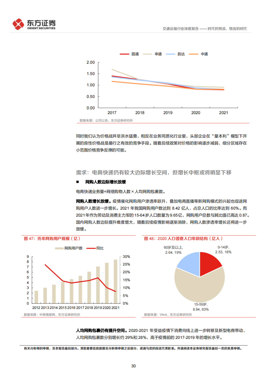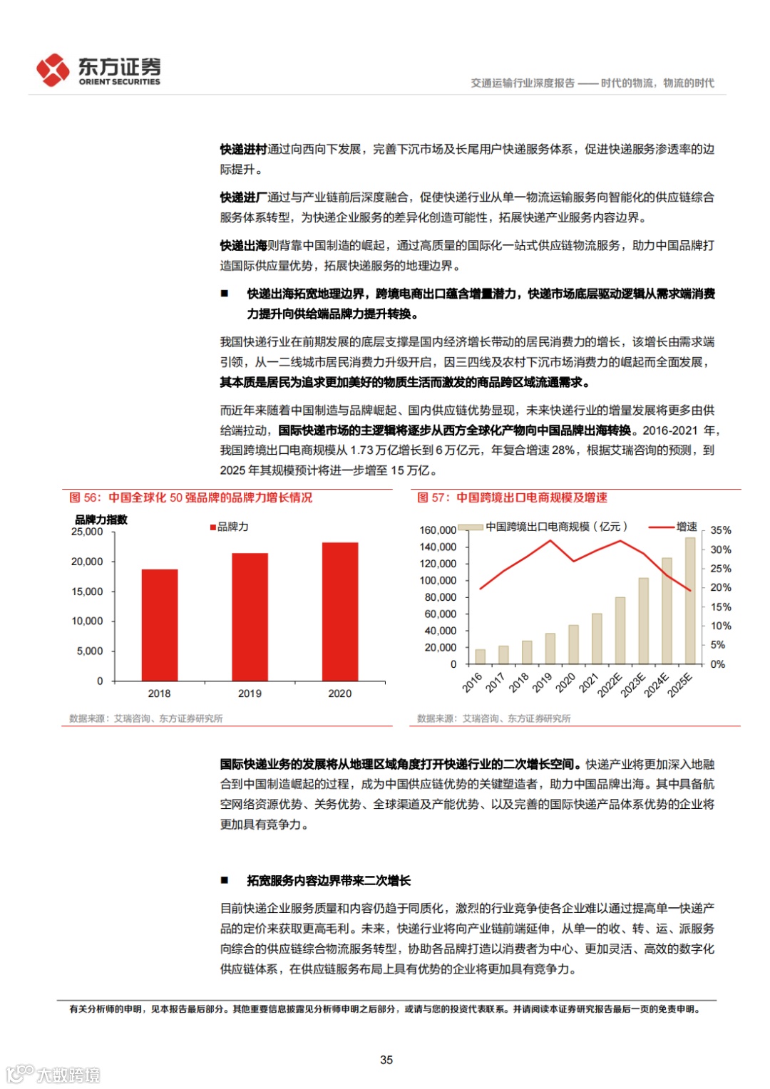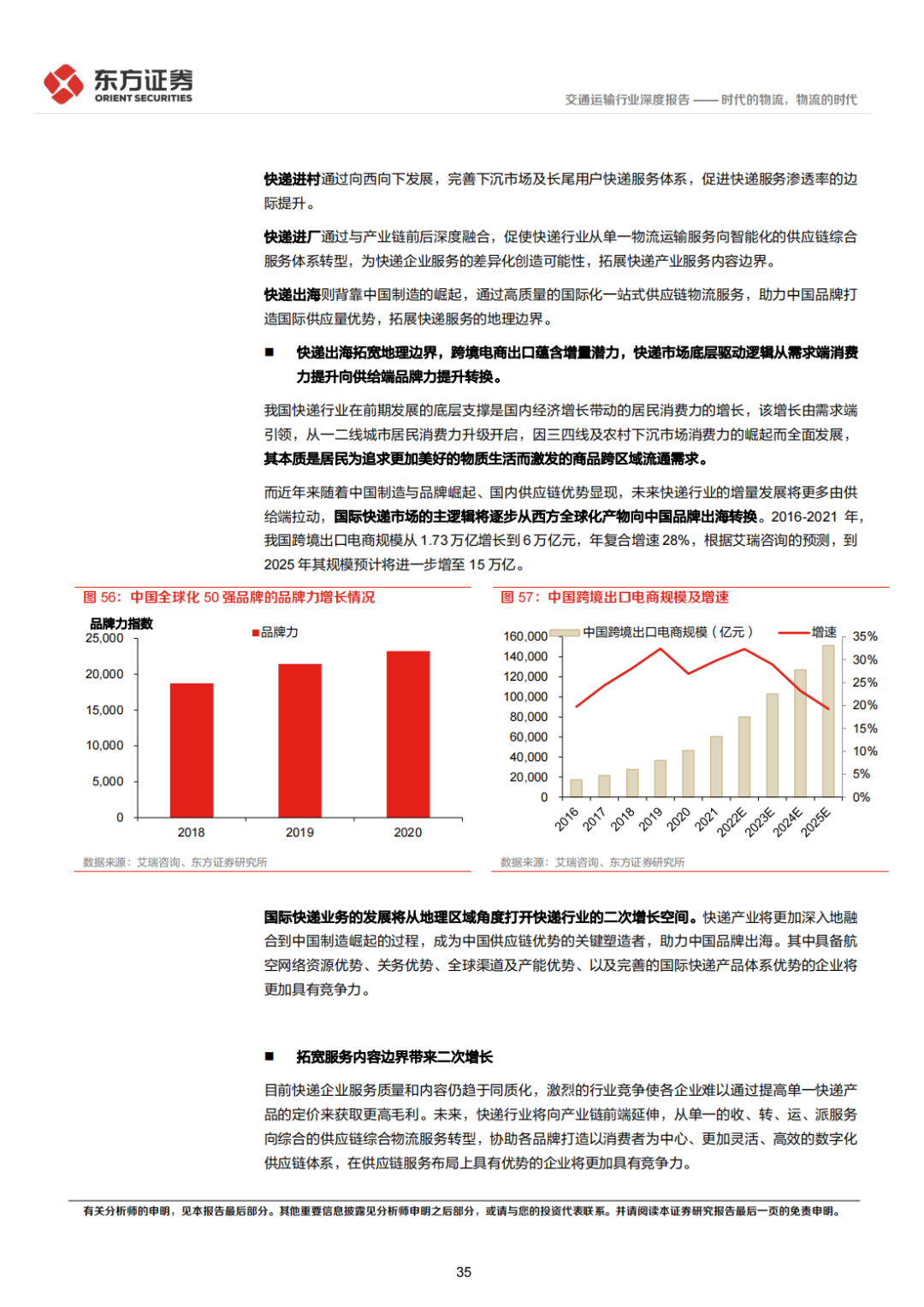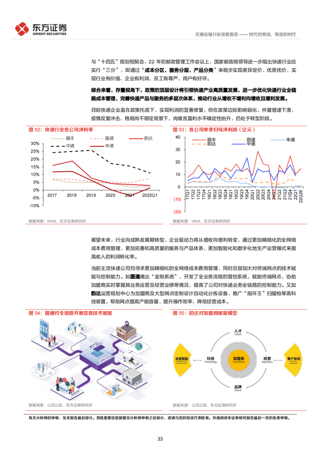 最终产品物流:快递的转型升级和“两进一出”。1)中短期来看,快递行业处于从成长竞争期向成熟发展期过渡的关键阶段,行业逐步从价格战后的利润修复走向盈利能力的持续提升。政策底已现,行业重回健康竞争秩序,市场需求仍有较大的增长空间,但增长中枢或将明显下移,企业自身经营质量成为主导因素;2)中长期来看,政策指引快递产业迈入高质量发展阶段,推动行业拓展服务地理边界与内容边界,深度挖掘二次增长曲线。对于存量市场,竞争焦点集中于通过网络精细化管理、智能化技术的应用等,推动收入向利润转化,从增收走向增利;对于增量市场,通过“两进一出”,企业将拓展服务地理边界与内容边界,从中国消费力崛起的底层逻辑向中国品牌与制造崛起的逻辑切换,开启总量的二次增长。