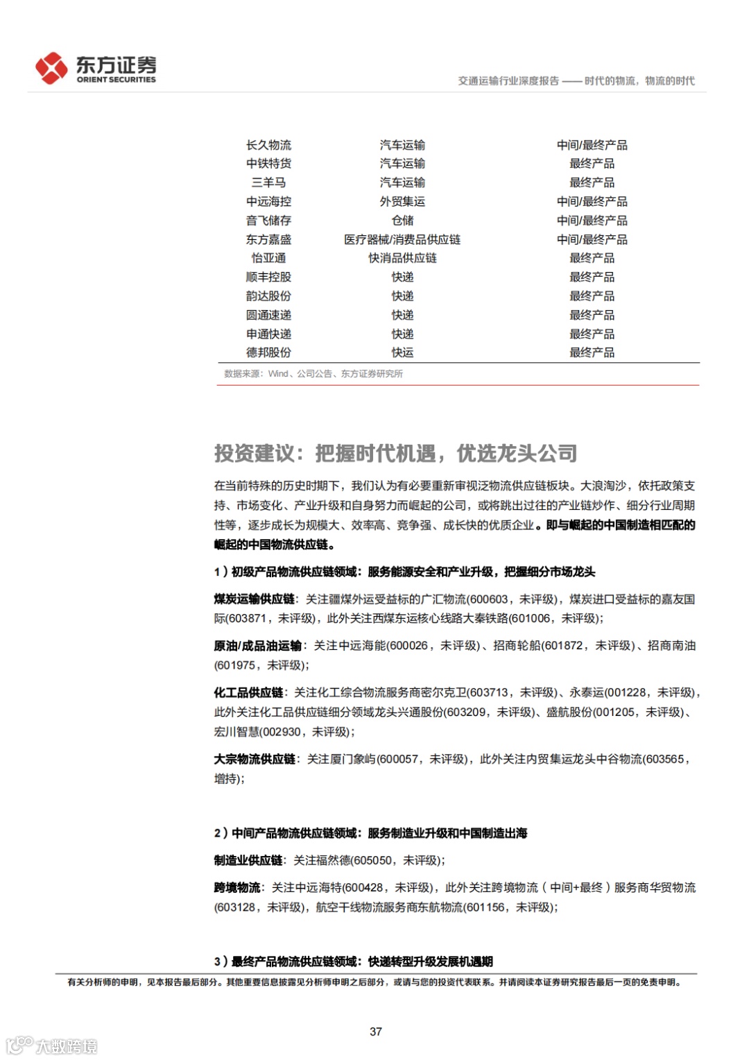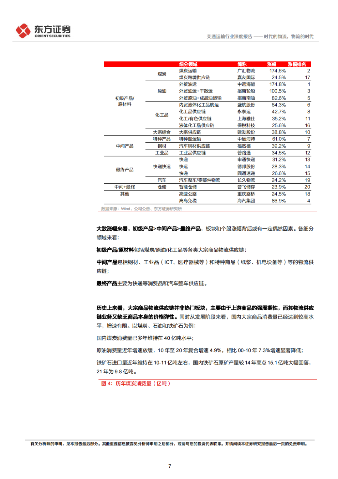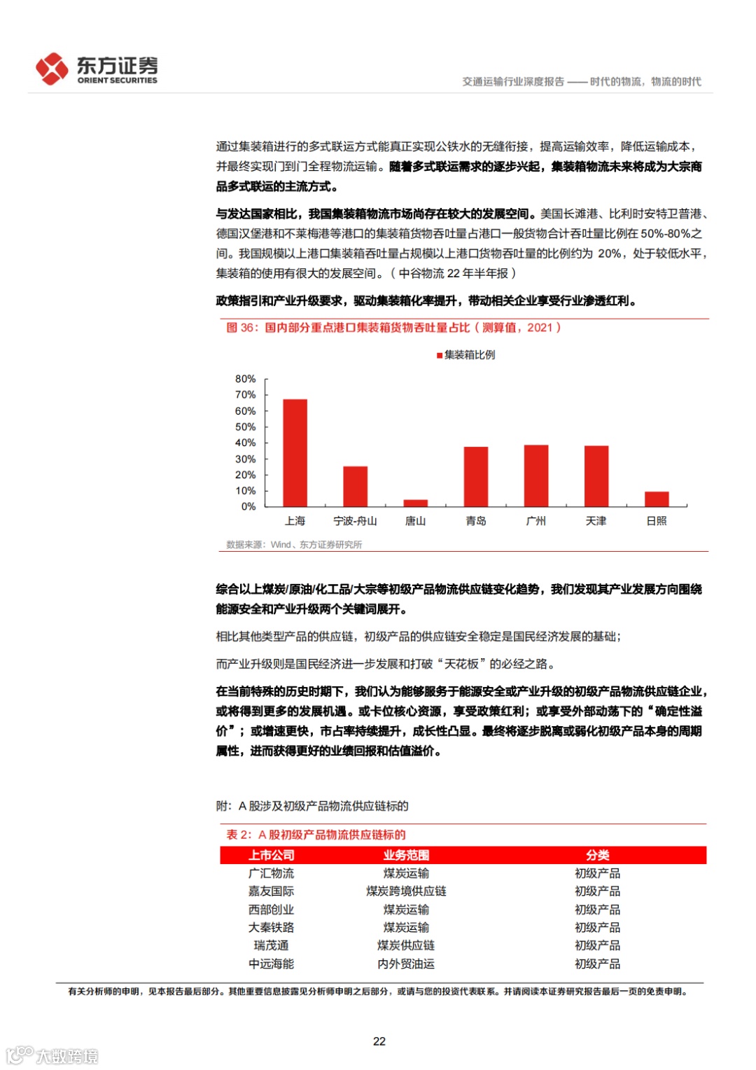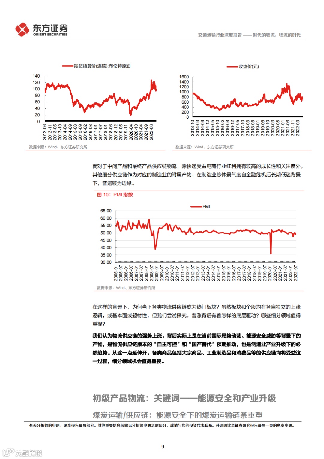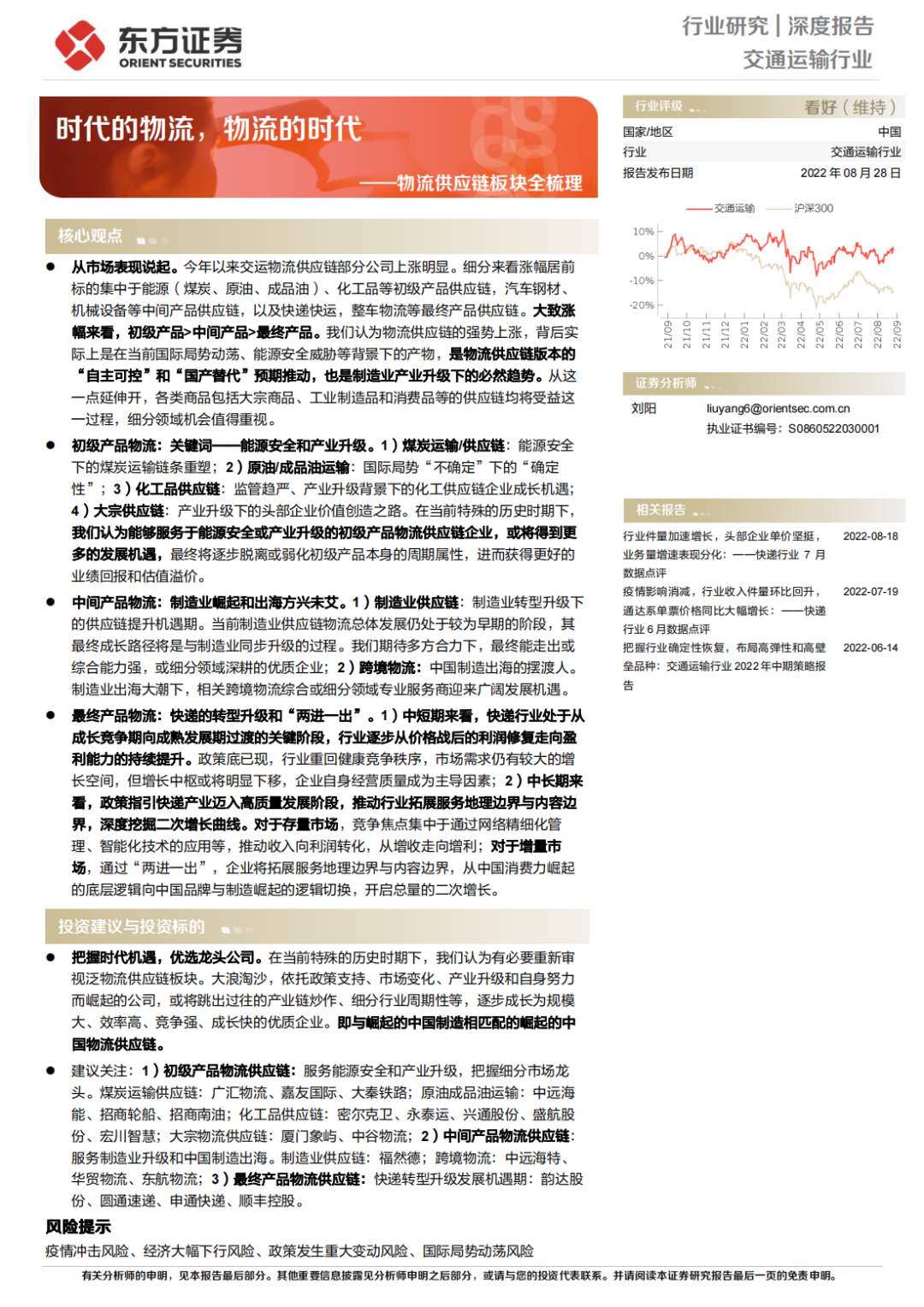 初级产品物流:关键词——能源安全和产业升级。1)煤炭运输/供应链:能源安全下的煤炭运输链条重塑;2)原油/成品油运输:国际局势“不确定”下的“确定性”;3)化工品供应链:监管趋严、产业升级背景下的化工供应链企业成长机遇;4)大宗供应链:产业升级下的头部企业价值创造之路。在当前特殊的历史时期下,我们认为能够服务于能源安全或产业升级的初级产品物流供应链企业,或将得到更多的发展机遇,最终将逐步脱离或弱化初级产品本身的周期属性,进而获得更好的业绩回报和估值溢价。
