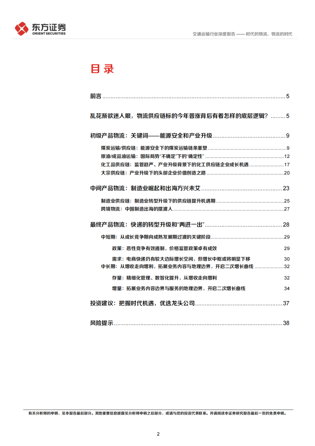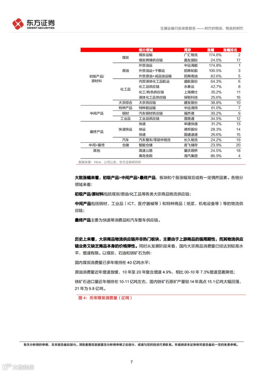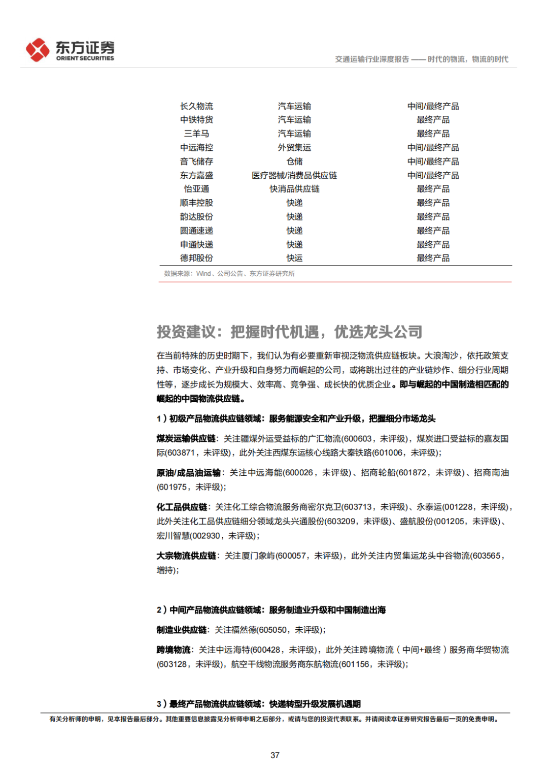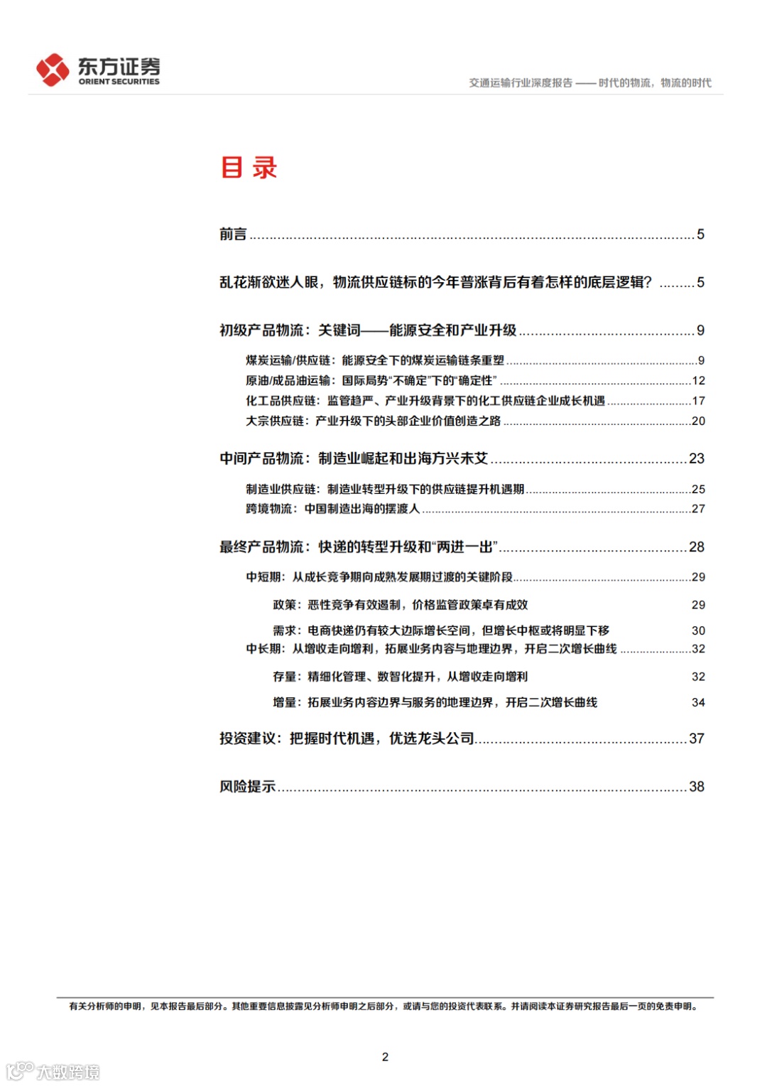 初级产品物流:关键词——能源安全和产业升级。1)煤炭运输/供应链:能源安全下的煤炭运输链条重塑;2)原油/成品油运输:国际局势“不确定”下的“确定性”;3)化工品供应链:监管趋严、产业升级背景下的化工供应链企业成长机遇;4)大宗供应链:产业升级下的头部企业价值创造之路。在当前特殊的历史时期下,我们认为能够服务于能源安全或产业升级的初级产品物流供应链企业,或将得到更多的发展机遇,最终将逐步脱离或弱化初级产品本身的周期属性,进而获得更好的业绩回报和估值溢价。