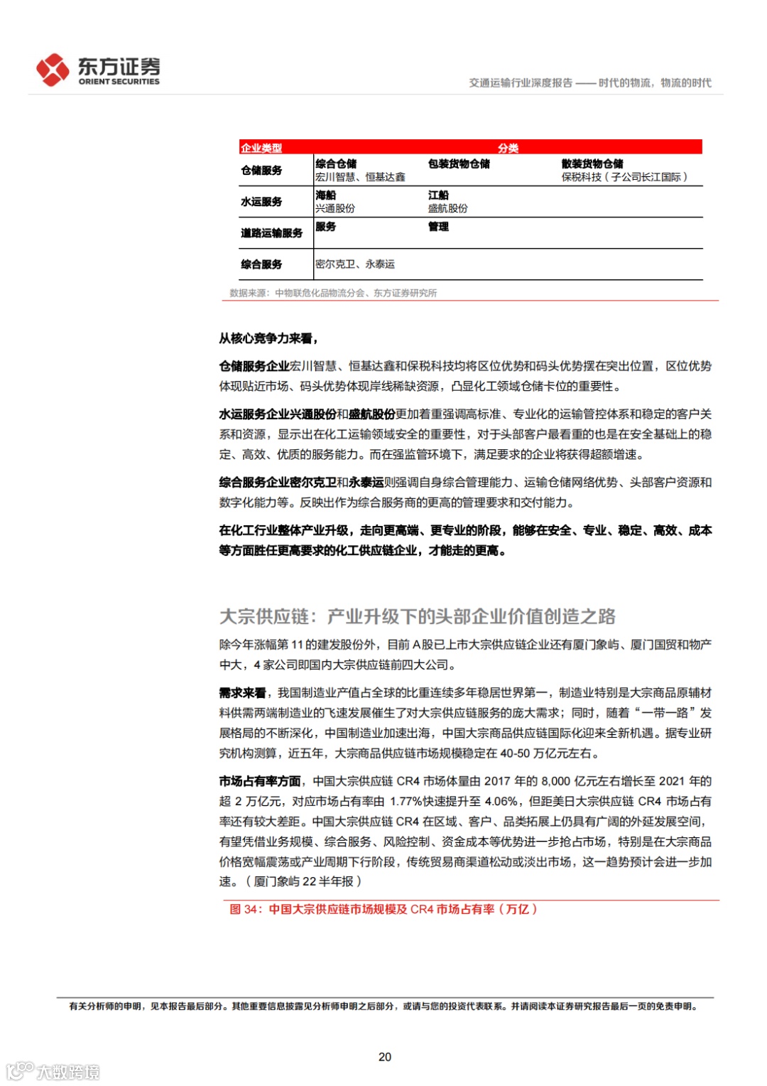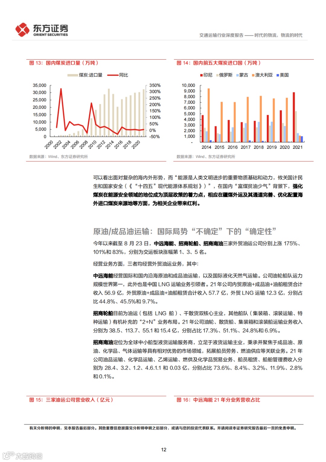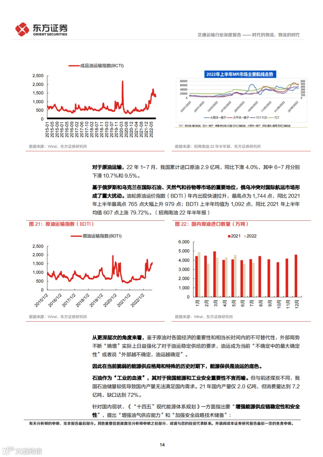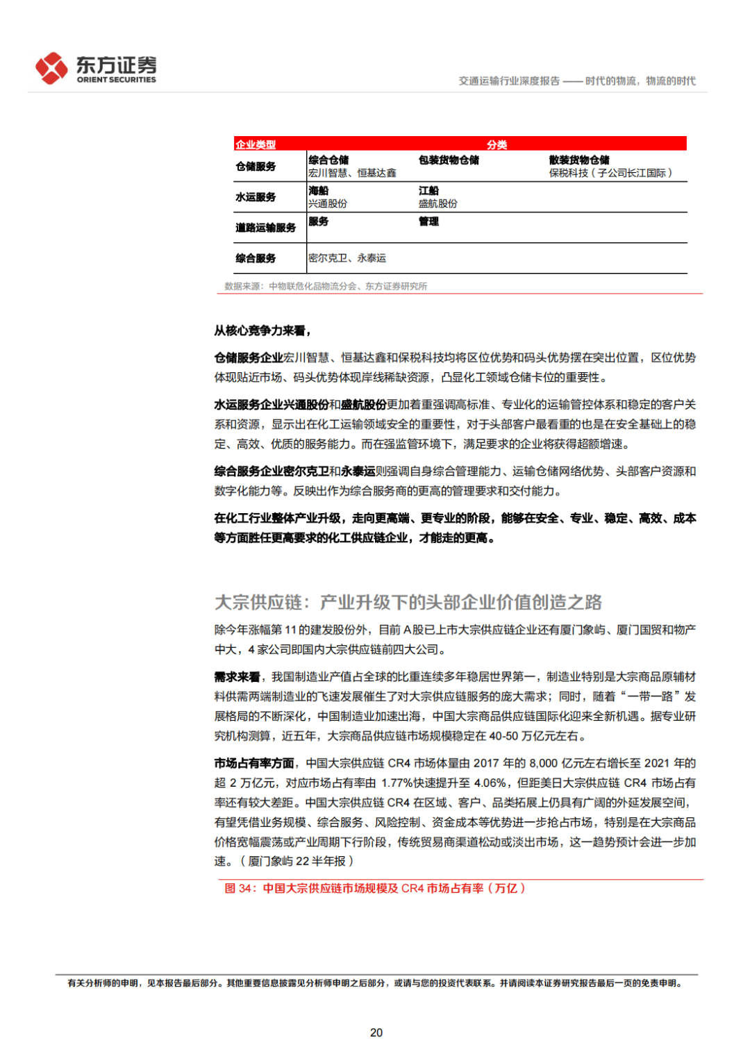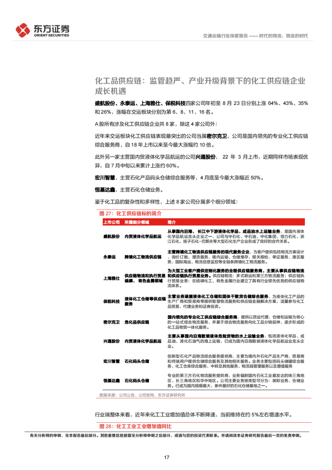 初级产品物流:关键词——能源安全和产业升级。1)煤炭运输/供应链:能源安全下的煤炭运输链条重塑;2)原油/成品油运输:国际局势“不确定”下的“确定性”;3)化工品供应链:监管趋严、产业升级背景下的化工供应链企业成长机遇;4)大宗供应链:产业升级下的头部企业价值创造之路。在当前特殊的历史时期下,我们认为能够服务于能源安全或产业升级的初级产品物流供应链企业,或将得到更多的发展机遇,最终将逐步脱离或弱化初级产品本身的周期属性,进而获得更好的业绩回报和估值溢价。