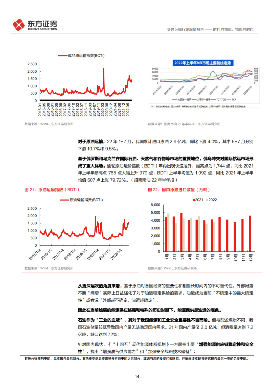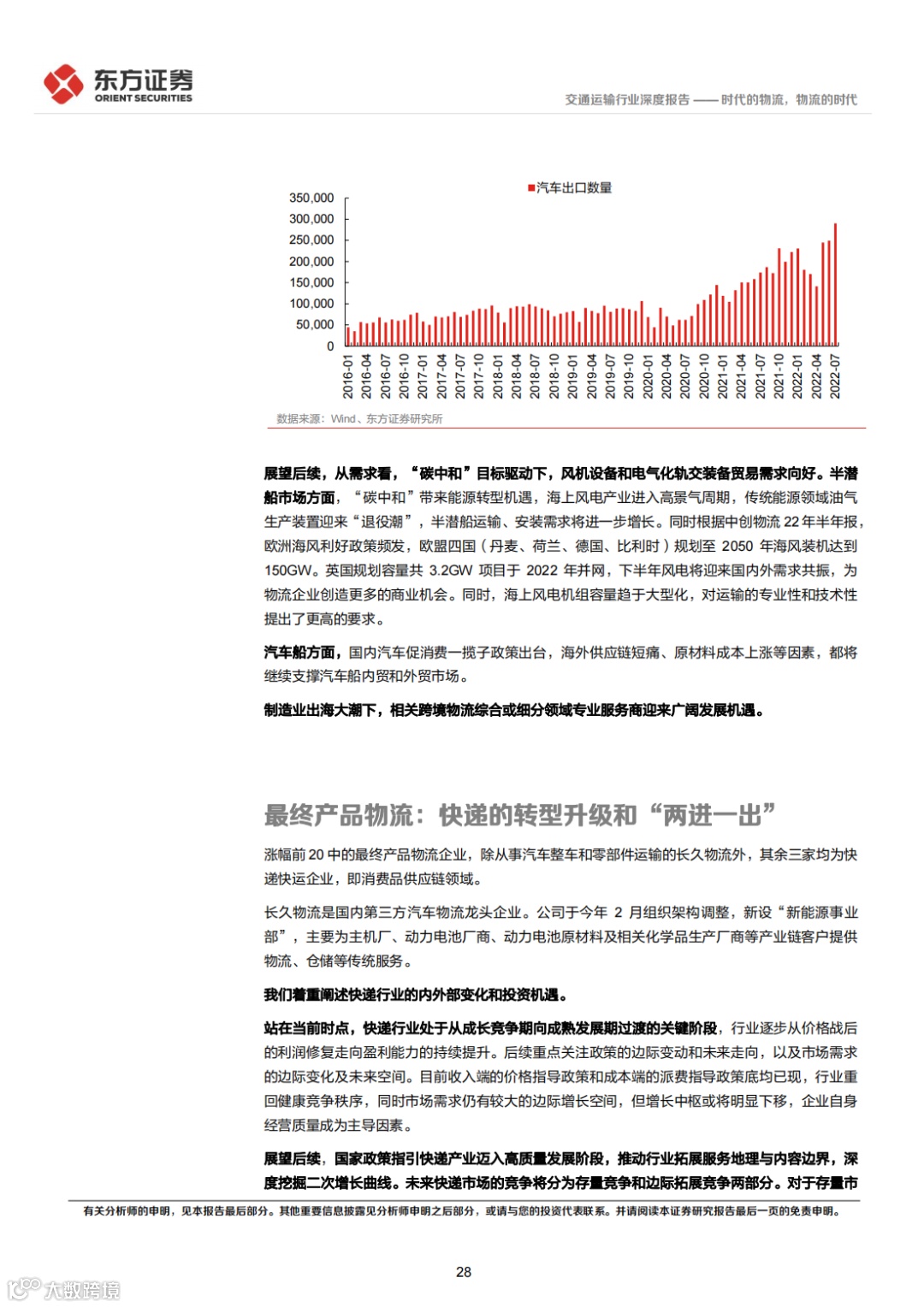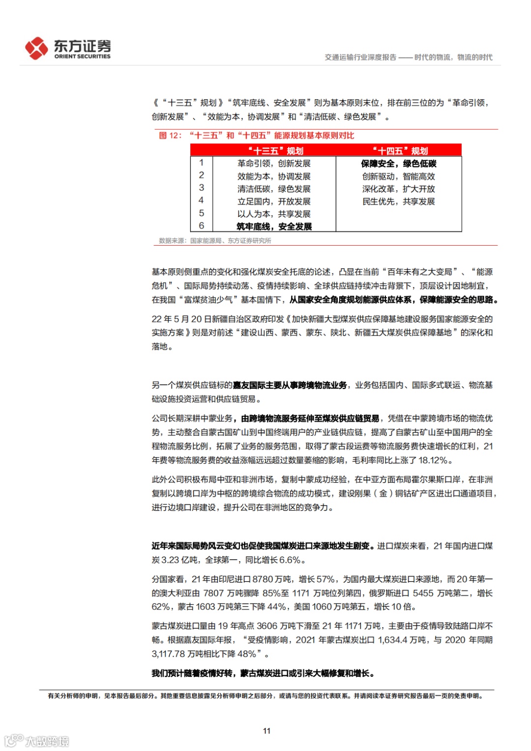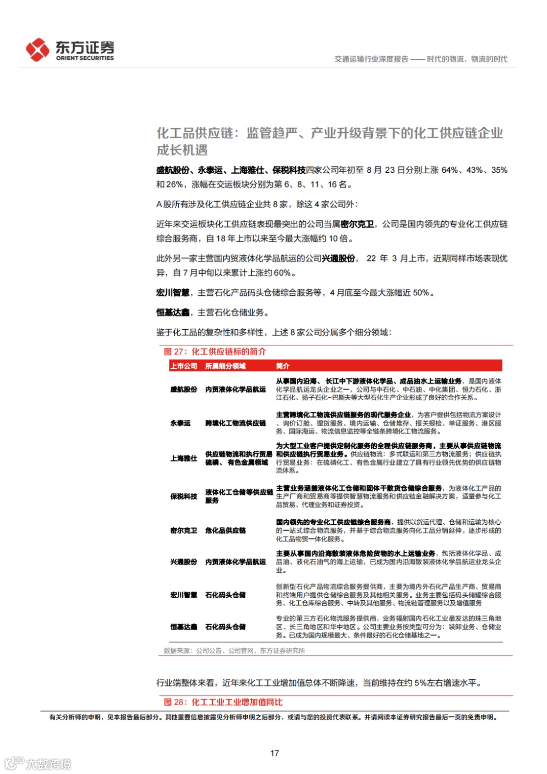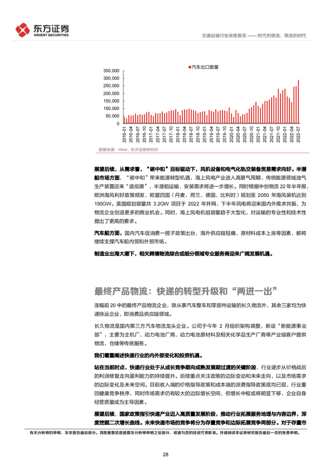 初级产品物流:关键词——能源安全和产业升级。1)煤炭运输/供应链:能源安全下的煤炭运输链条重塑;2)原油/成品油运输:国际局势“不确定”下的“确定性”;3)化工品供应链:监管趋严、产业升级背景下的化工供应链企业成长机遇;4)大宗供应链:产业升级下的头部企业价值创造之路。在当前特殊的历史时期下,我们认为能够服务于能源安全或产业升级的初级产品物流供应链企业,或将得到更多的发展机遇,最终将逐步脱离或弱化初级产品本身的周期属性,进而获得更好的业绩回报和估值溢价。