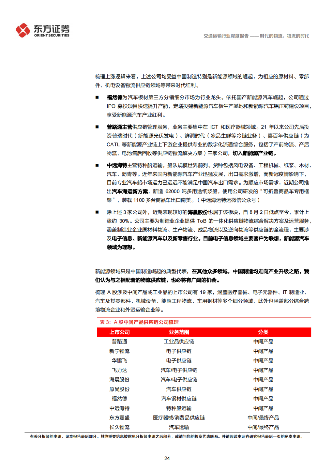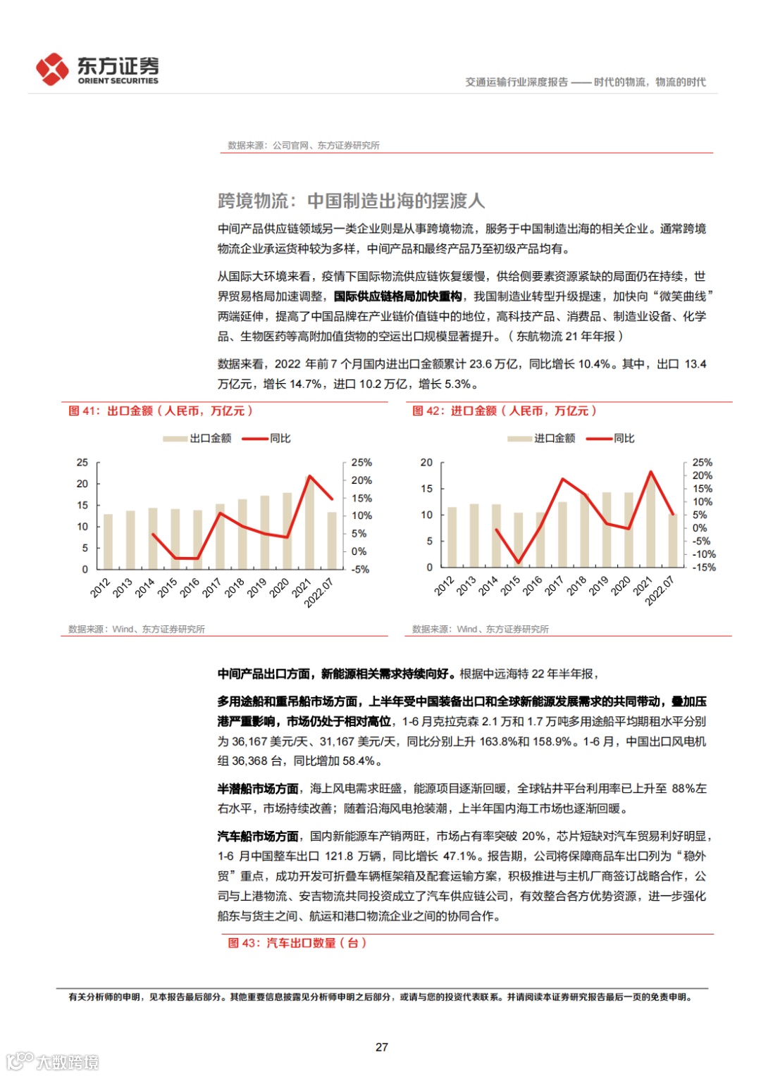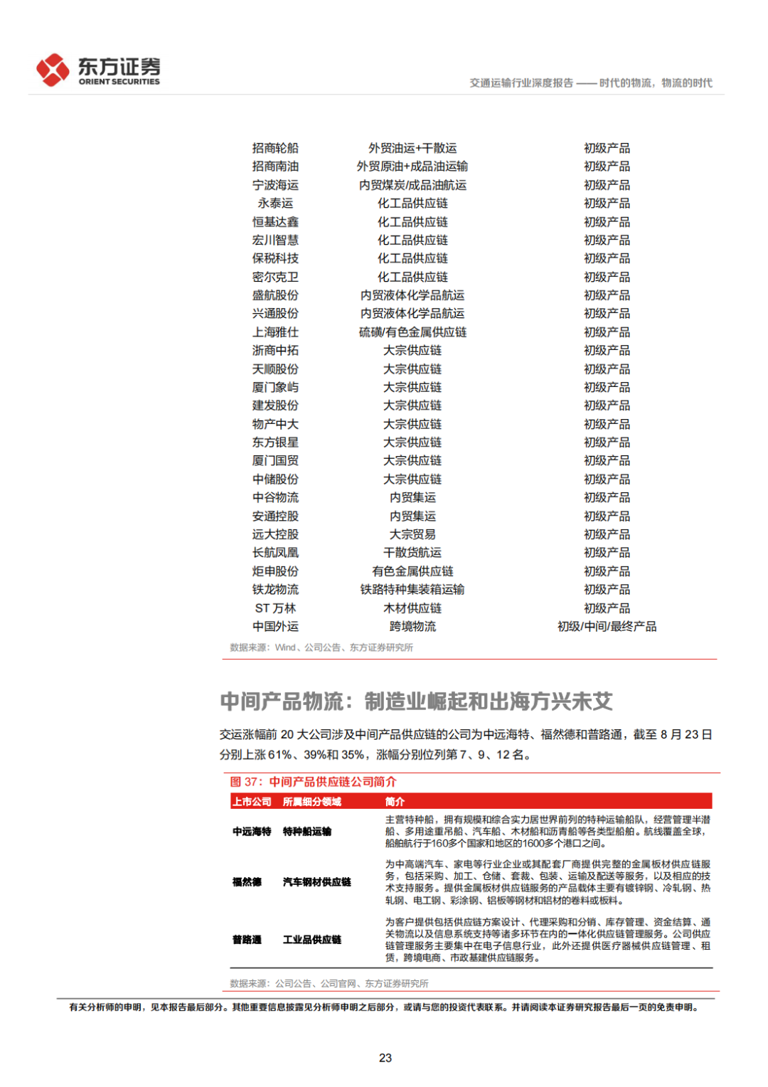 中间产品物流:制造业崛起和出海方兴未艾。1)制造业供应链:制造业转型升级下的供应链提升机遇期。当前制造业供应链物流总体发展仍处于较为早期的阶段,其最终成长路径将是与制造业同步升级的过程。我们期待多方合力下,最终能走出或综合能力强,或细分领域深耕的优质企业;2)跨境物流:中国制造出海的摆渡人。制造业出海大潮下,相关跨境物流综合或细分领域专业服务商迎来广阔发展机遇。