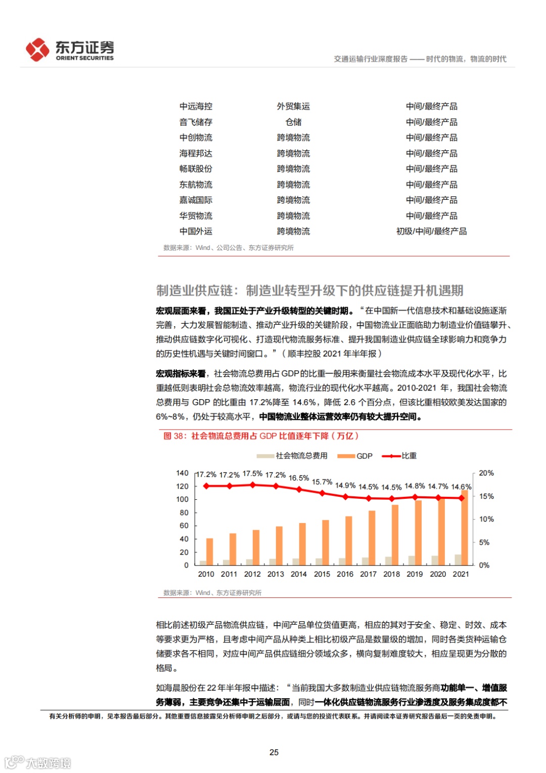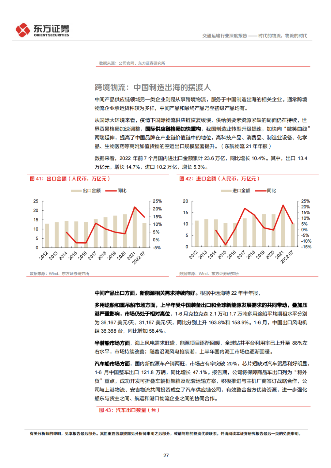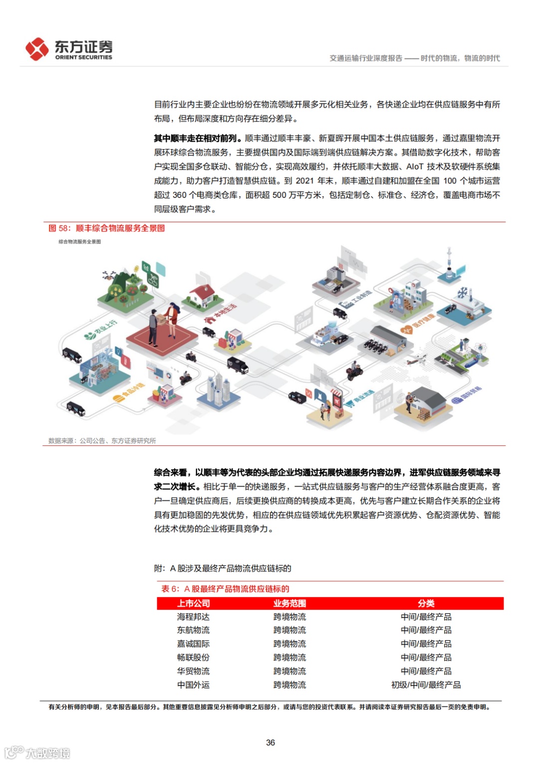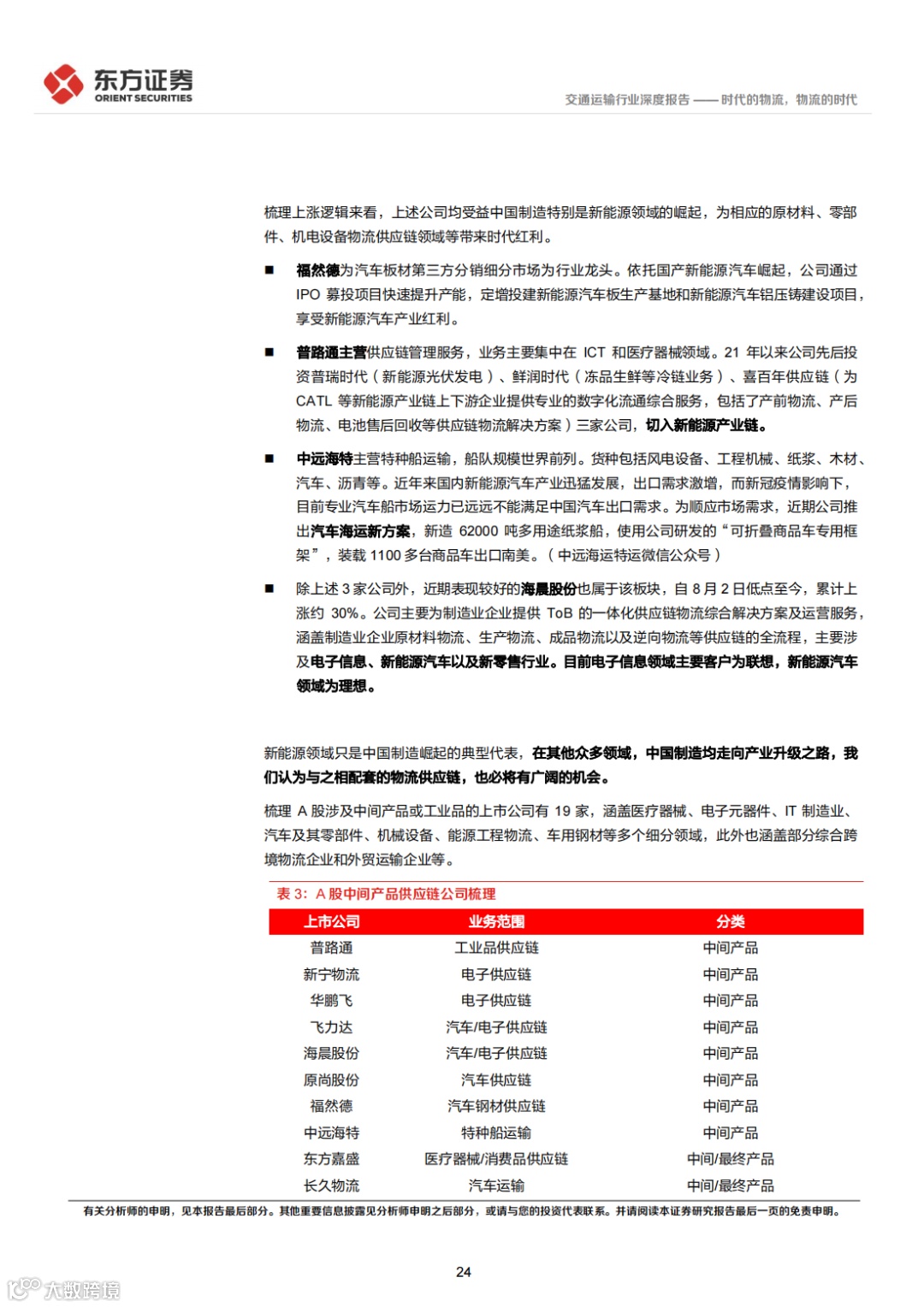 中间产品物流:制造业崛起和出海方兴未艾。1)制造业供应链:制造业转型升级下的供应链提升机遇期。当前制造业供应链物流总体发展仍处于较为早期的阶段,其最终成长路径将是与制造业同步升级的过程。我们期待多方合力下,最终能走出或综合能力强,或细分领域深耕的优质企业;2)跨境物流:中国制造出海的摆渡人。制造业出海大潮下,相关跨境物流综合或细分领域专业服务商迎来广阔发展机遇。