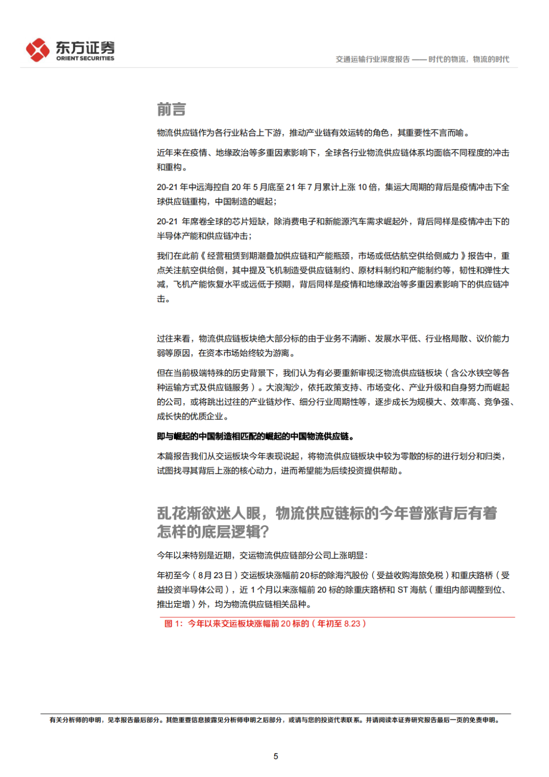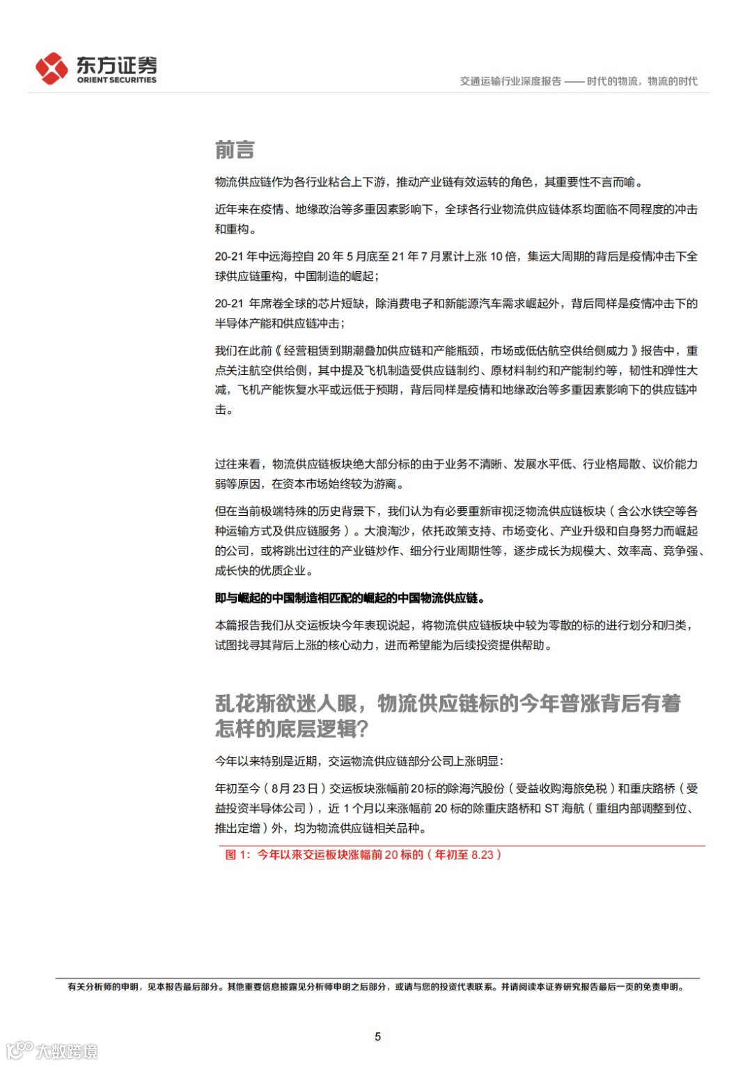 从市场表现说起。今年以来交运物流供应链部分公司上涨明显。细分来看涨幅居前标的集中于能源(煤炭、原油、成品油)、化工品等初级产品供应链,汽车钢材、机械设备等中间产品供应链,以及快递快运,整车物流等最终产品供应链。大致涨幅来看,初级产品>中间产品>最终产品。我们认为物流供应链的强势上涨,背后实际上是在当前国际局势动荡、能源安全威胁等背景下的产物,是物流供应链版本的“自主可控”和“国产替代”预期推动,也是制造业产业升级下的必然趋势。从这一点延伸开,各类商品包括大宗商品、工业制造品和消费品等的供应链均将受益这一过程,细分领域机会值得重视。