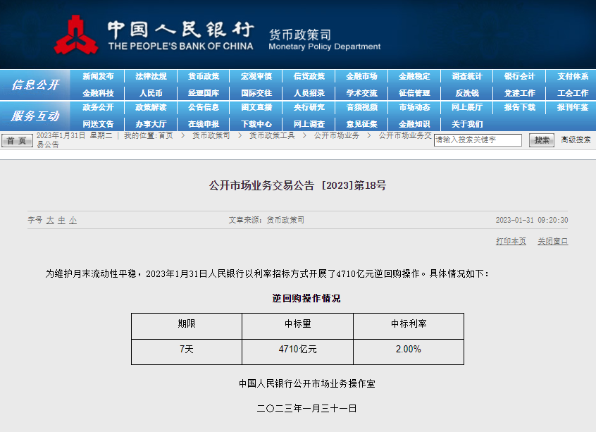 为维护月末流动性平稳,2023年1月31日,人民银行以利率招标方式开展了7天期4710亿元逆回购操作,中标利率2.00%。根据Wind数据,当日3010亿元逆回购到期,净投放1700亿元。