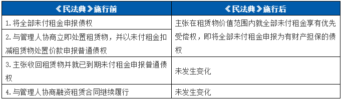 《最高人民法院关于适用〈中华人民共和国民法典〉有关担保制度的解释》(法释〔2020〕28号)第65条第1款规定:“在融资租赁合同中,承租人未按照约定支付租金,经催告后在合理期限内仍不支付,出租人请求承租人支付全部剩余租金,并以拍卖、变卖租赁物所得的价款受偿的,人民法院应予支持;当事人请求参照民事诉讼法‘实现担保物权案件’的有关规定,以拍卖、变卖租赁物所得价款支付租金的,人民法院应予准许。”在此规定下,《民法典》施行前出租人选择的“以全部未付租金作为债权向管理人申报”“与管理人协商立即处置租赁物,并以未付租金扣减租赁物处置价款申报普通债权”方案将发生调整,出租人选择申报租金债权的,可以同时主张在租赁物价值范围内就全部未付租金享有优先受偿权。即使出租人希望由管理人代为处置租赁物的,仍然可以先申报租金债权为有财产担保债权,再由管理人根据工作进度处置租赁物。因此,在《民法典》施行后,预计将不再有出租人选择“与管理人协商立即处置租赁物,并以未付租金扣减租赁物处置价款申报普通债权”方案。