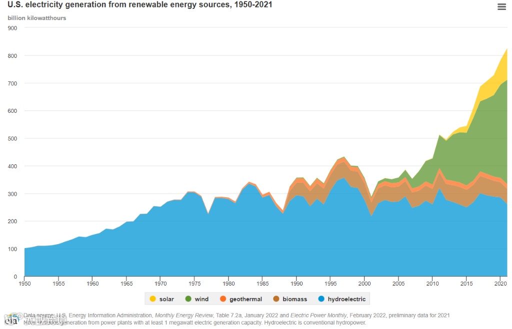 可再生能源中,过去十年里,风能和太阳能在美国的电力系统中占比迅速扩大。