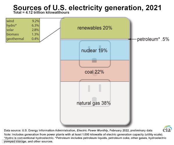 根据美国能源部信息署(EIA)的数据,全美电力中,38%来自天然气,22%来自煤炭,大约5%来自石油。核能贡献了全美19%的电力,剩余的20%则来自可再生能源,其中占比最大的为风电,达到9.2%;水电则贡献了6.3%的电能,太阳能的占比接近3%。