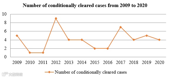 In 2020, the SAMR conditionally approved four cases, a relatively stable number compared with 2019 (five cases). Figure 1 (below) illustrates the number of cases conditionally cleared from 2009 to 2020.