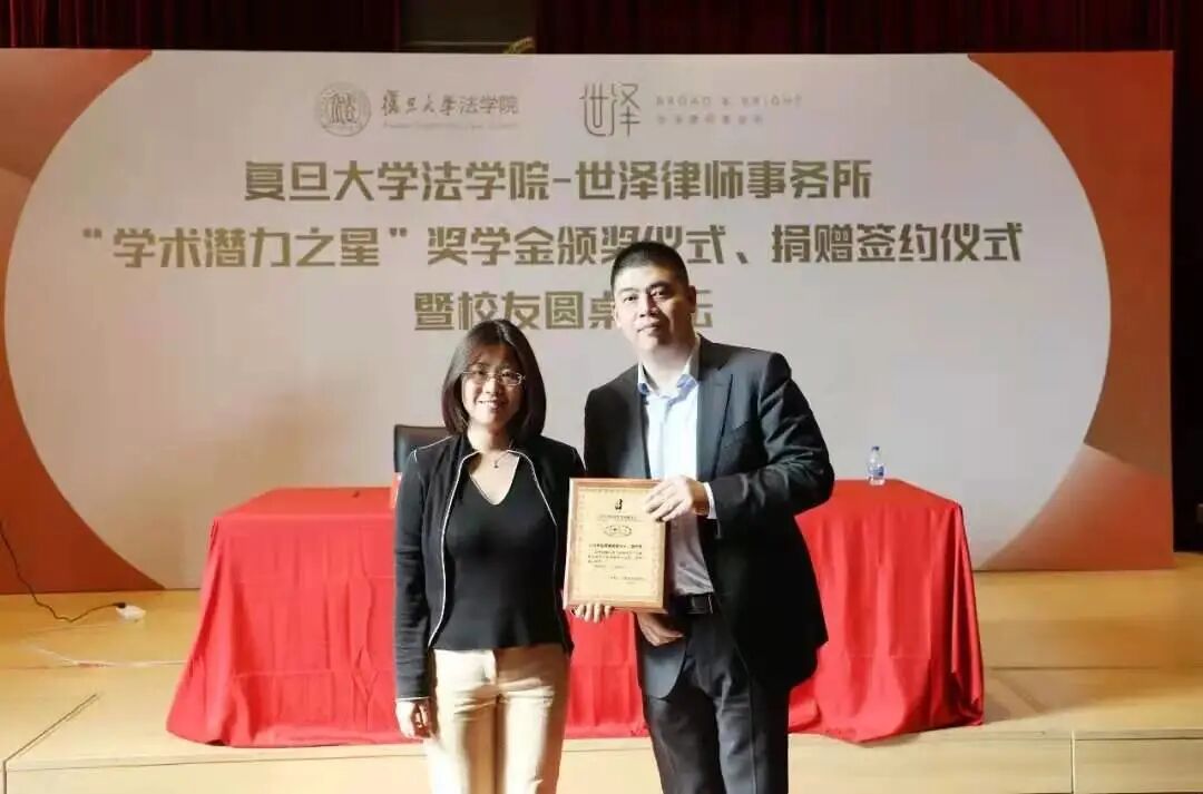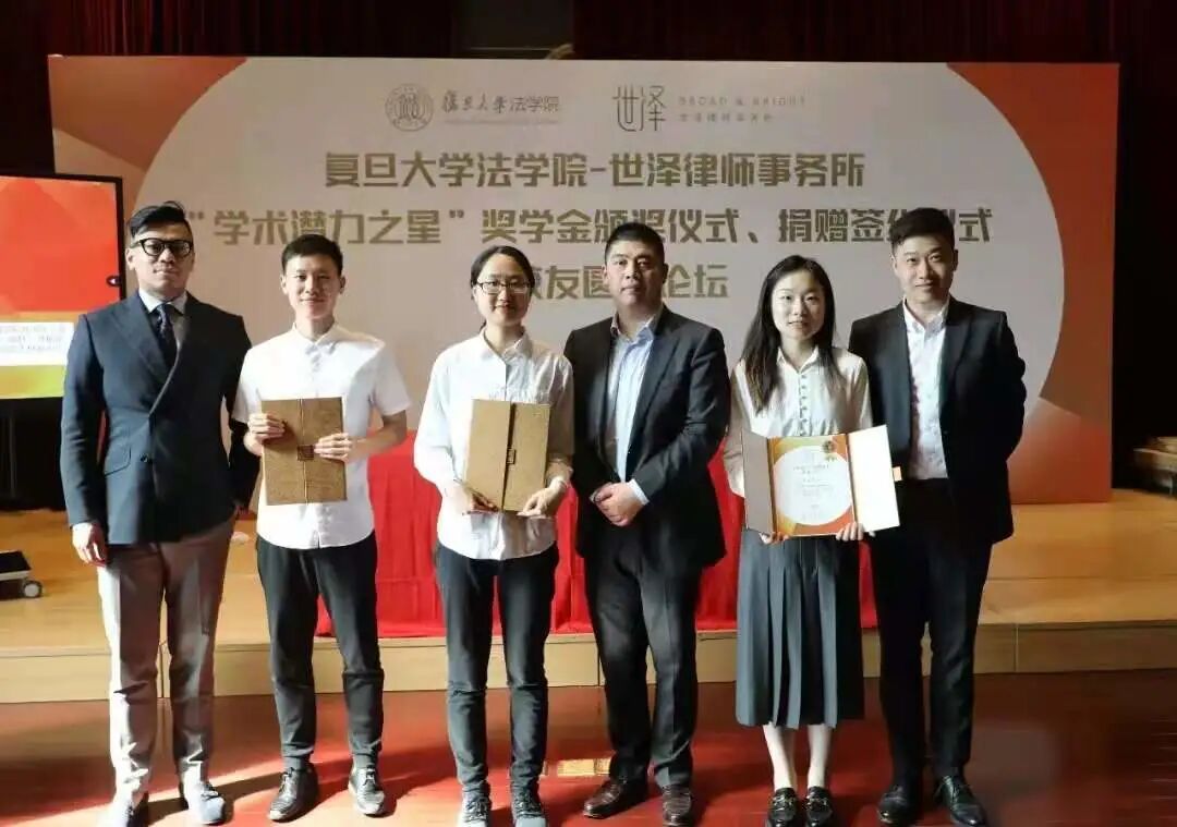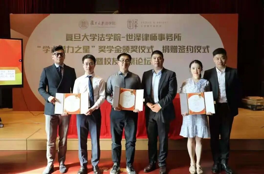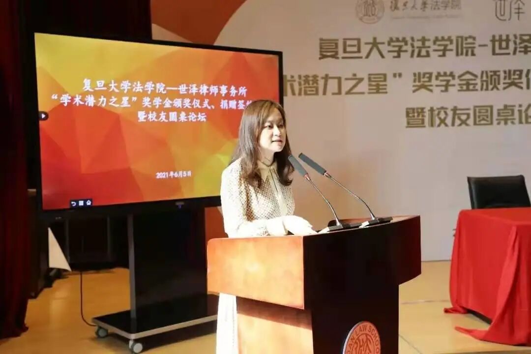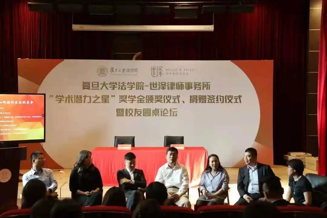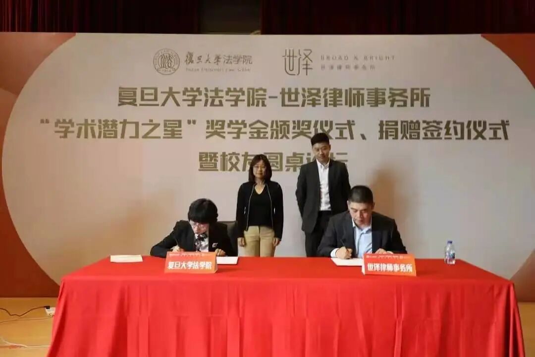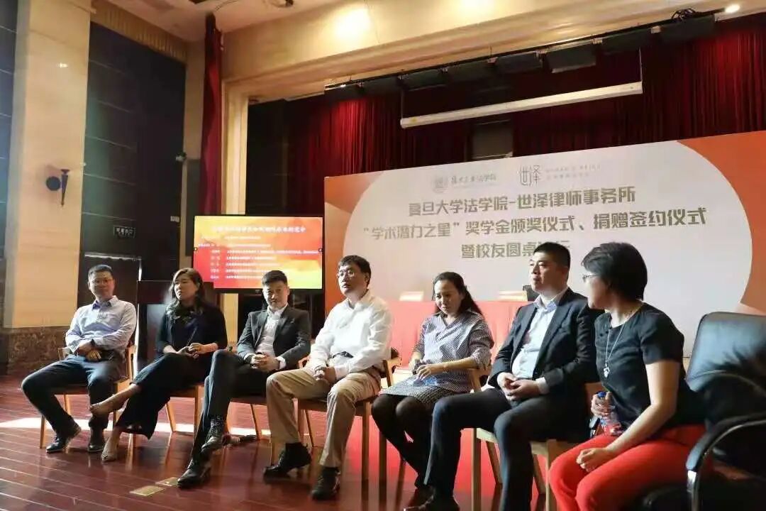 2021年6月5日下午,复旦大学法学院-世泽律师事务所“学术潜力之星”奖学金颁奖仪式、捐赠签约仪式暨校友圆桌论坛在复旦大学廖凯原法学楼举行。