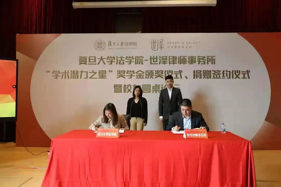 当日,世泽律师事务所与复旦大学签订两项捐赠基金。分别为复旦大学法学院世泽国际经济行政法研究基金与复旦大学法学院世泽模拟仲裁与模拟法庭资助基金。