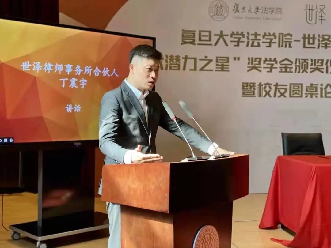 世泽律师事务所合伙人丁震宇律师(法学院1998级本科校友)回忆自己在法学院的学习生活经历,对母院所具有的国际眼光和交叉学科优势特色表示赞同。丁律师表示,复旦法学院具有深厚的学术底蕴和悠久的学术传统,校友有责任积极支持学院的学科建设,助力学院培养优秀的国际化复合型法律人才,为中国走向世界保驾护航。