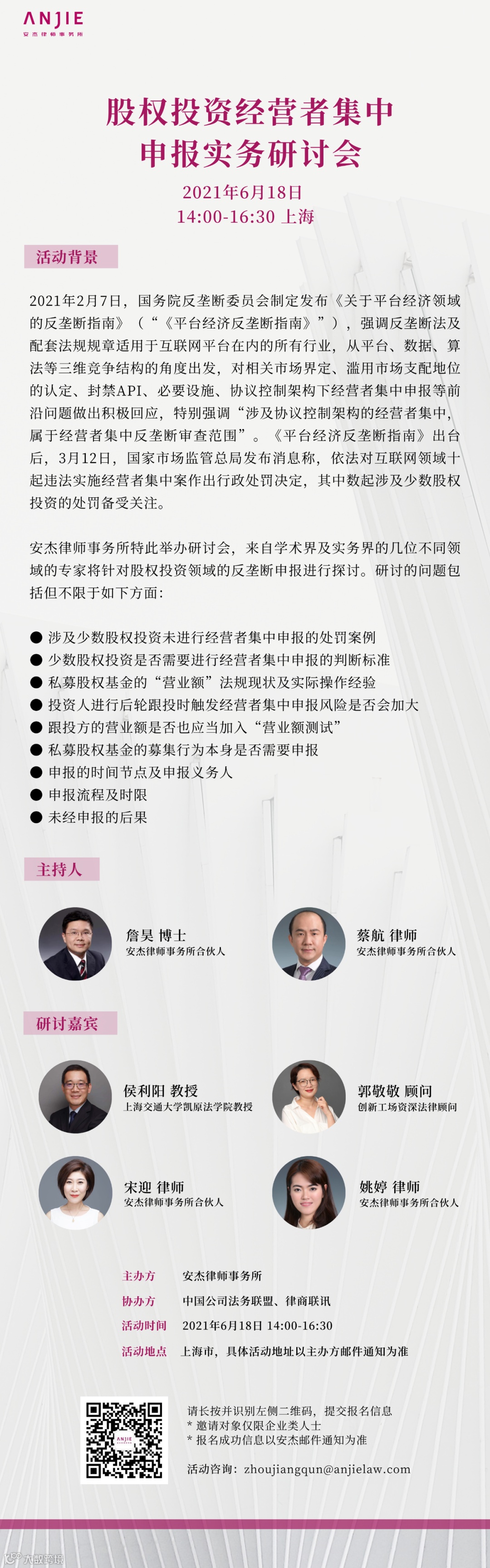 安杰律师事务所特此举办研讨会,来自学术界及实务界的几位不同领域的专家将针对股权投资领域的反垄断申报进行探讨。