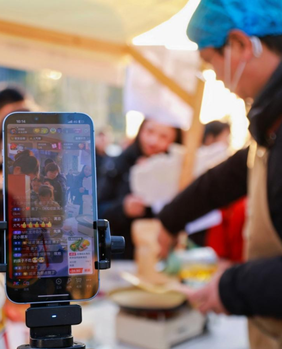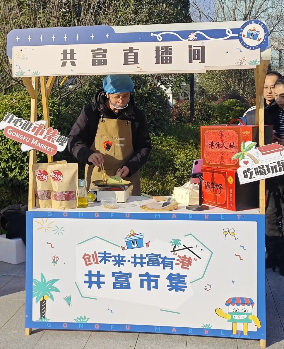 我会副秘书长高福总,抖音号:"囧哥吃货",助力共富直播间进行户外首播,现场展示龙港本土品牌产品,直播间观众和现场的游客们好评如潮。