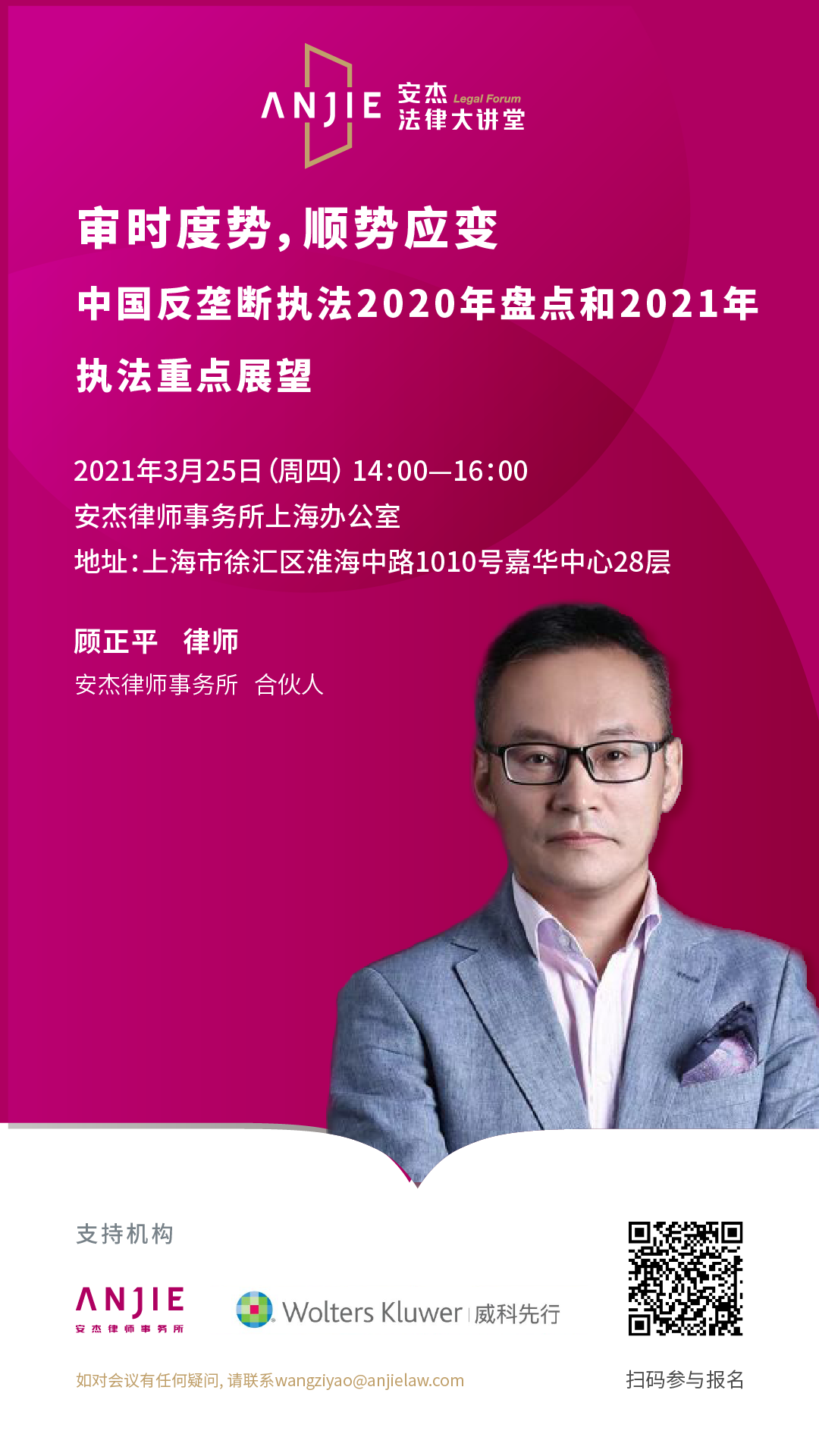 本讲座将通过盘点 2020 年反垄断领域的关键进展和重要事件,总结分析执法思路和动态趋势,为企业揭示 2021 年反垄断执法的重点领域和可能对企业商业模式和竞争策略产生的重大影响,解析合规重点难点与要点,并为企业提供贴近商业的法律问题解决方案。
