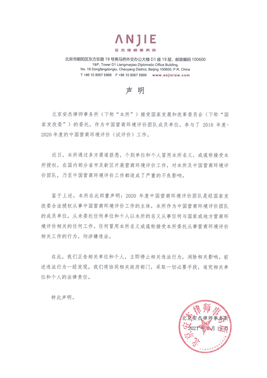 北京安杰律师事务所(下称“本所”)接受国家发展和改革委员会(下称“国家发改委”)委托,作为中国营商环境评价团队的成员单位,参与了2018年度-2020年度的中国营商环境评价(试评价)工作。