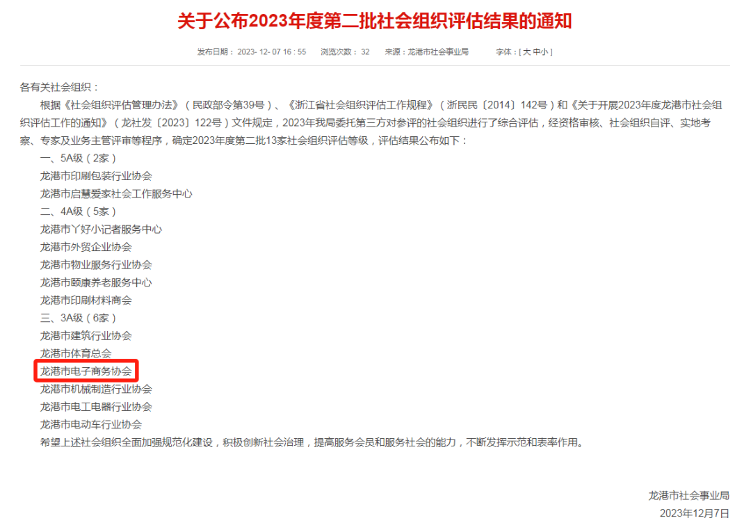 近日,龙港市社会事业局公布2023年度第二批社会组织评估结果,经资格审核、社会组织自评、实地考察、专家及业务主管评审等程序,龙港市电子商务协会首次被评为3A级社会组织。