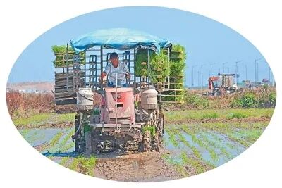 Δ农民驾驶农机在浙江省玉环市漩门湾三期智慧农业示范基地内进行“海水稻”插秧作业。
