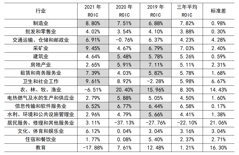 注:添加阴影单元格表示ROIC高于当年制造业贷款平均利率20个基点以上。