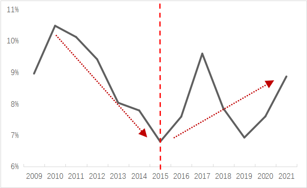 制造业作为中国国民经济体系中最重要的行业,在2010年受“人口红利”消失、产能过剩等因素影响后经历了一段时间的低谷期,行业投入资本回报率(ROIC)下降明显(见图2)。为更好地支持制造业高质量发展,中国相继颁布《中国制造2025》《国务院关于深化制造业与互联网融合发展的指导意见》《关于进一步推动金融服务制造业高质量发展的通知》等纲领性文件,从任务目标、重点领域、金融创新、帮扶政策、风险防范和监管协调等方面提出要求,对进一步强化金融支持制造业,提升制造业金融服务指明了方向。