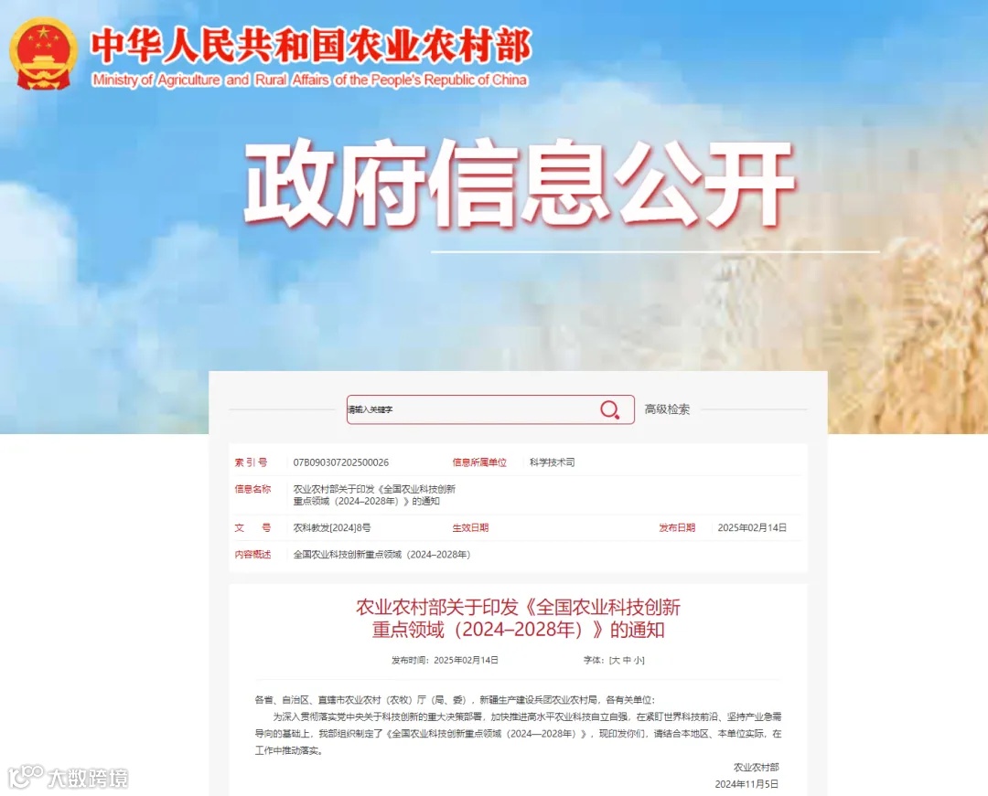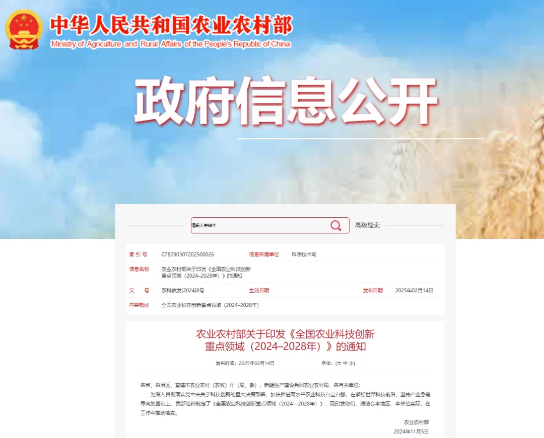 为深入贯彻落实党中央关于科技创新的重大决策部署,加快推进高水平农业科技自立自强,在紧盯世界科技前沿、坚持产业急需导向的基础上,农业农村部组织制定了《全国农业科技创新重点领域(2024—2028年)》,并于近日印发通知。