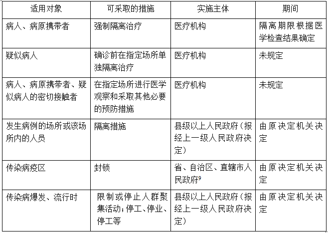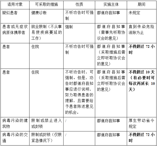 根据日本《感染症预防法》,针对法律规定的传染病可采取以下措施: