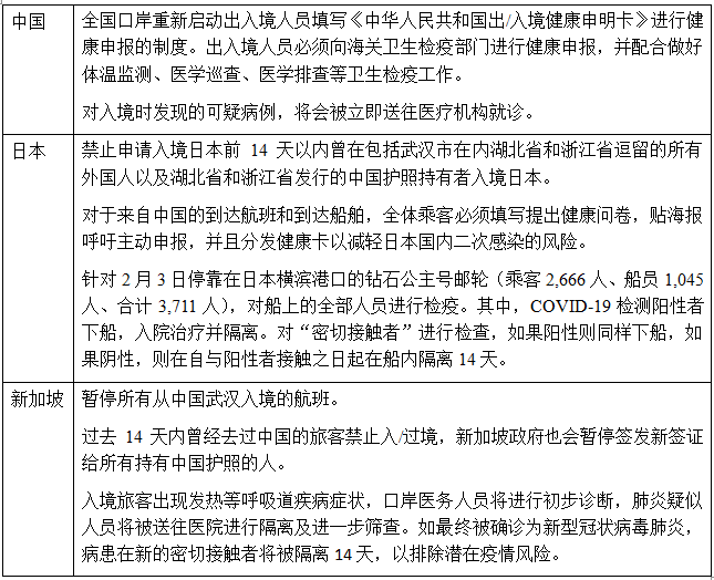 目前,中国、日本和新加坡在防止国外新冠肺炎传播入境方面均已采取了在法律规定下可采取的措施,但新加坡更为严格,已全面禁止中国护照持有者入境,而日本仅禁止湖北省和浙江省签发的中国护照持有者入境。相关措施列举如下:
