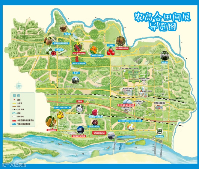 农高会展馆区—农高会农业技术田间推广展(7个田间综合展示点)—农高会农业技术田间推广展(13个田间参观点)—尚特梅斯庄园—杨凌蘸水面街区