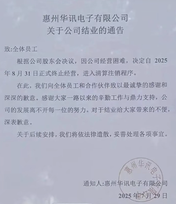 惠州华讯电子有限公司近日发布结业通告,宣布将自2025年8月31日起正式终止运营并进入清算注销程序。这一决策标志着这家成立于1998年的珠三角老牌港资制造企业的正式倒闭。
