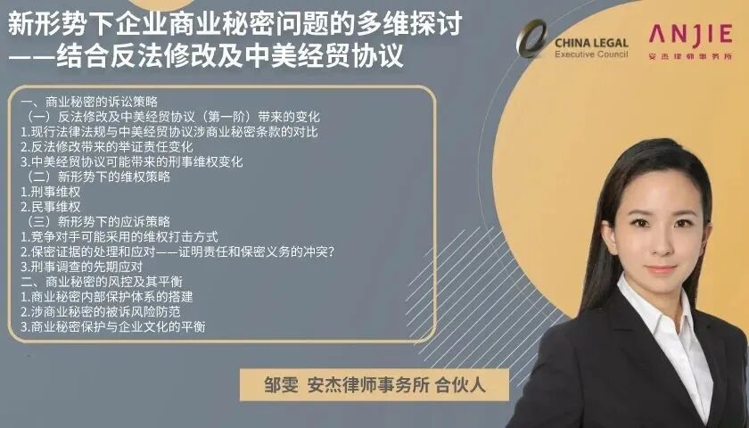 2020年3月31日,由LCOUNCIL主办,以“新形势下企业商业秘密问题的多维探讨——结合反法修改及中美经贸协议”为主题的线上直播会议圆满落幕。安杰律师事务所合伙人邹雯受邀出席会议并作为主讲嘉宾与参会的中外资企业法务、合规人士等一同聚焦于多维度分析企业商业秘密保护中的法律问题。